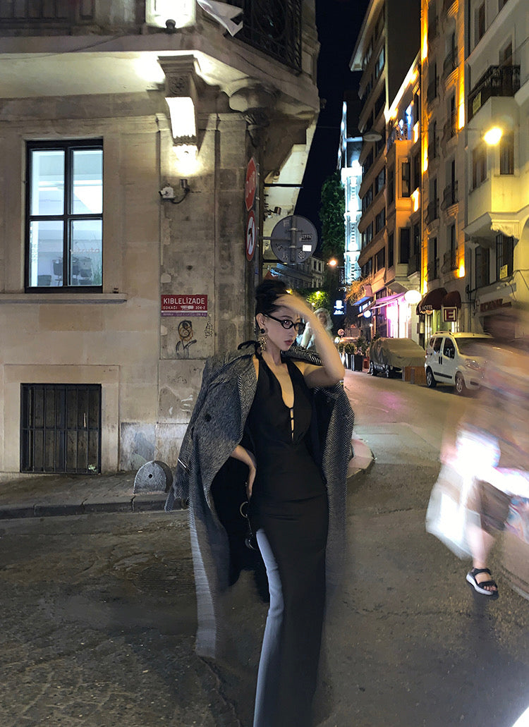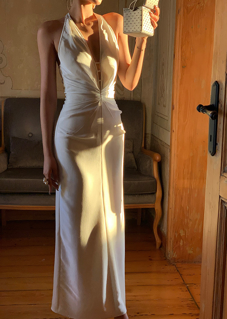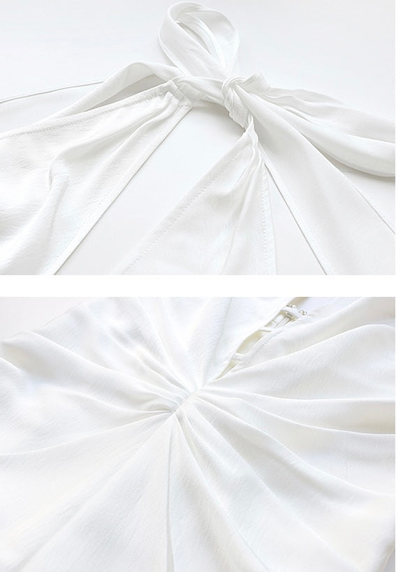The adjustable halter neckline ties gently at the back, shaping the shoulders and subtly refining the bust. We placed three inner hook-and-loop fasteners along the front to keep everything secure and discreet.