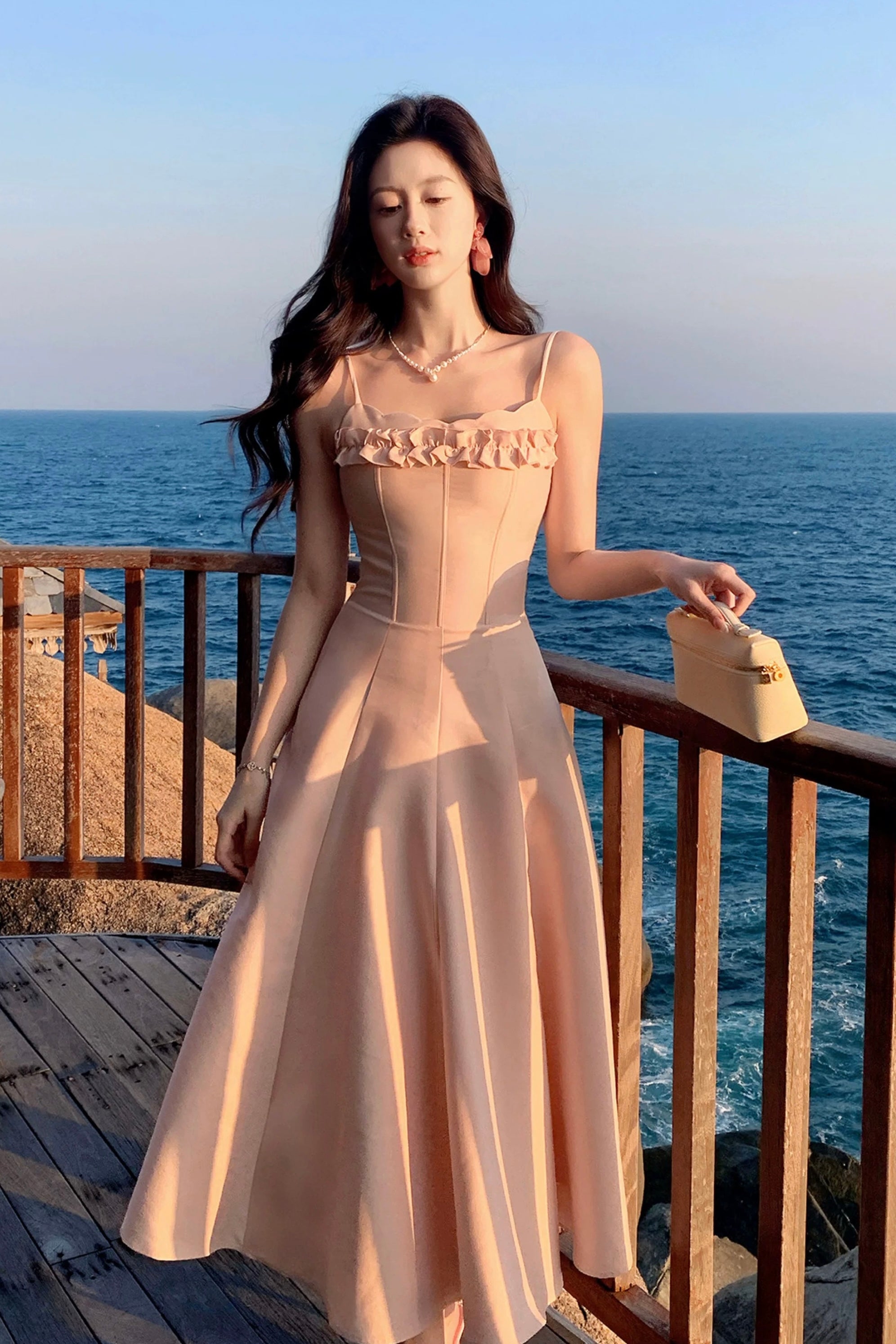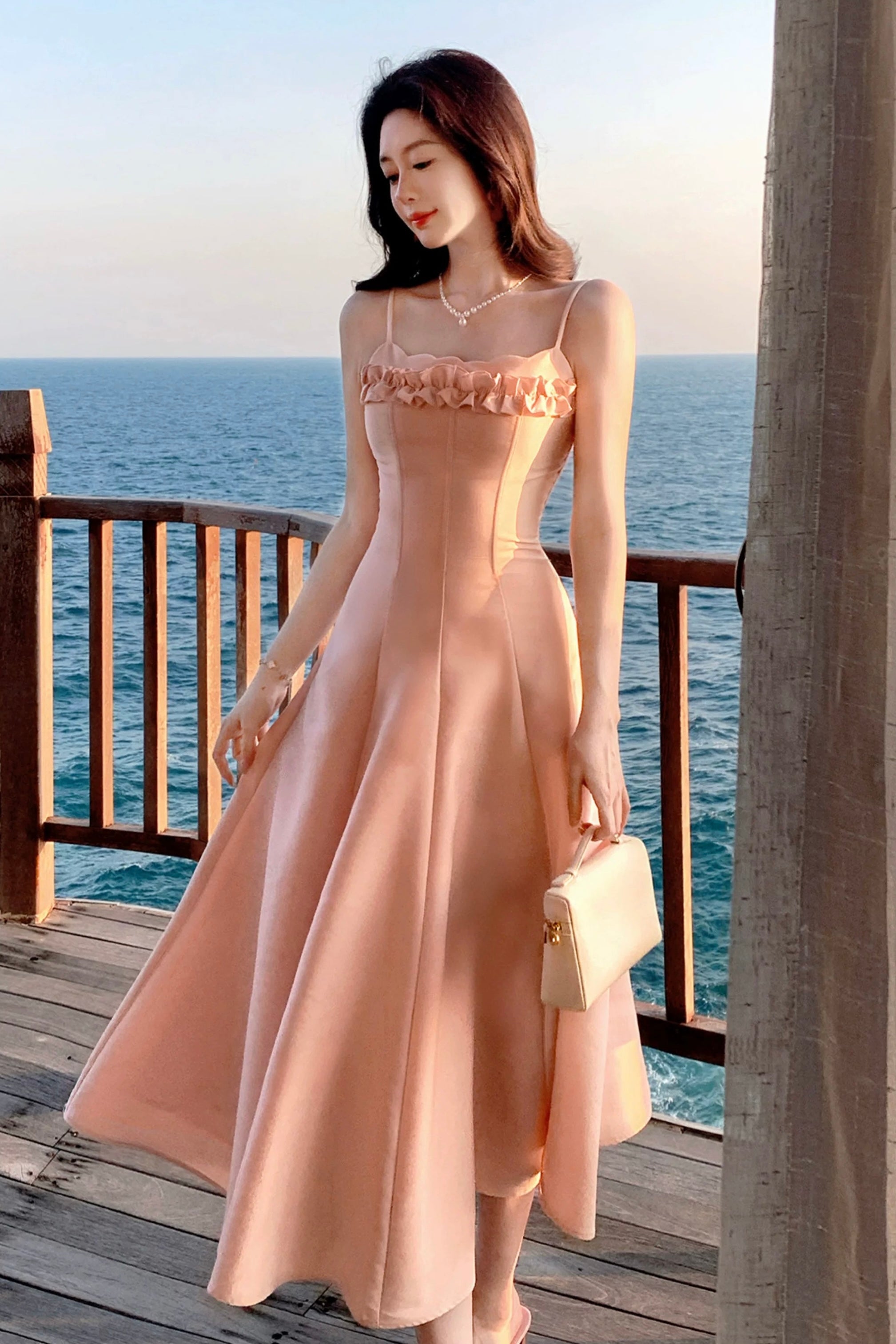 We chose a structured matte fabric with beautiful drape and a subtle firmness to support the volume of the skirt, so it holds its shape without collapsing, while the gentle tone casts its own soft focus glow. Inside, breathable four way stretch lining ensures all day comfort, whether you’re heading to the office, strolling seaside on holiday, dressing for a date, or attending a light evening soirée.