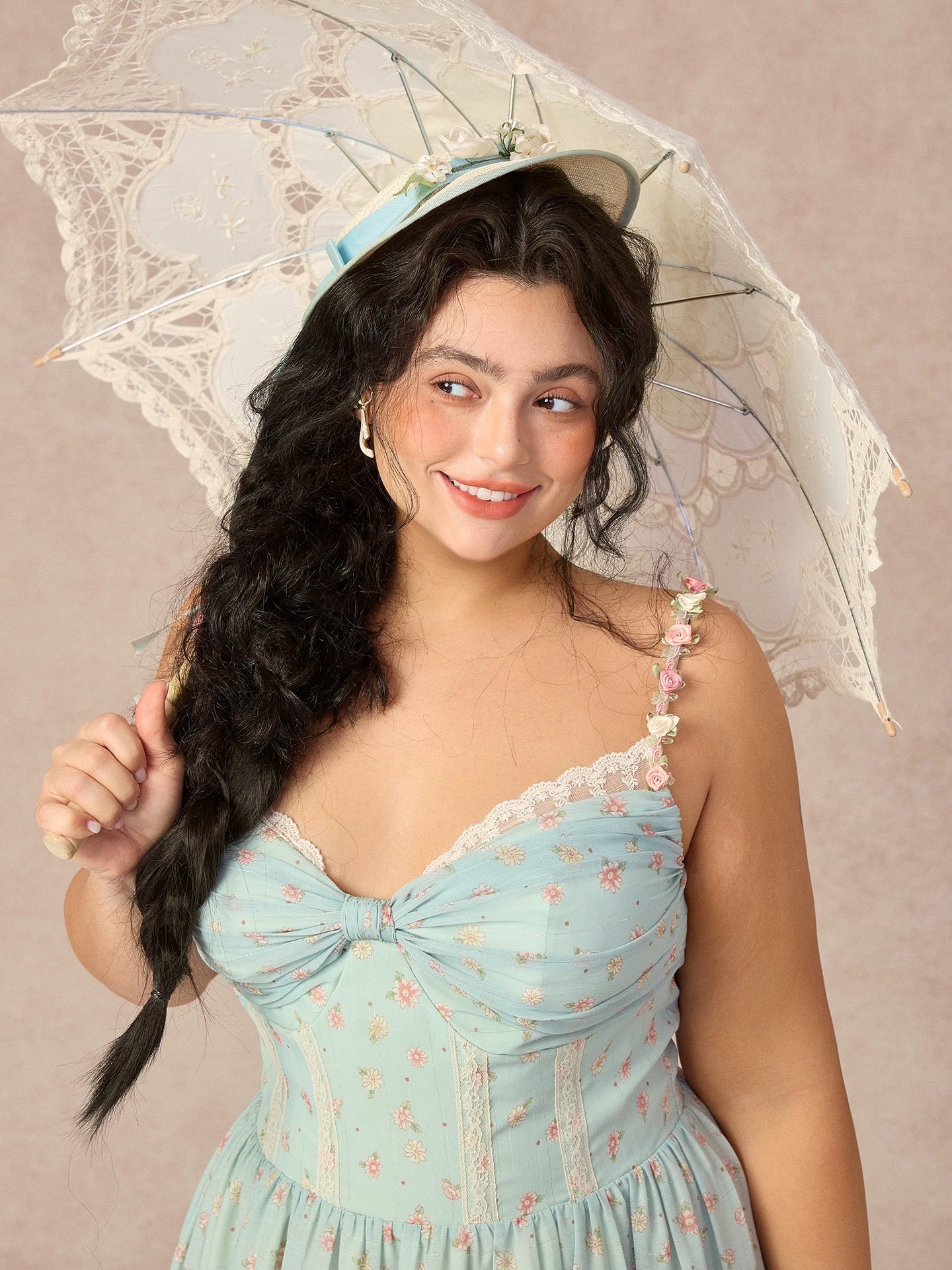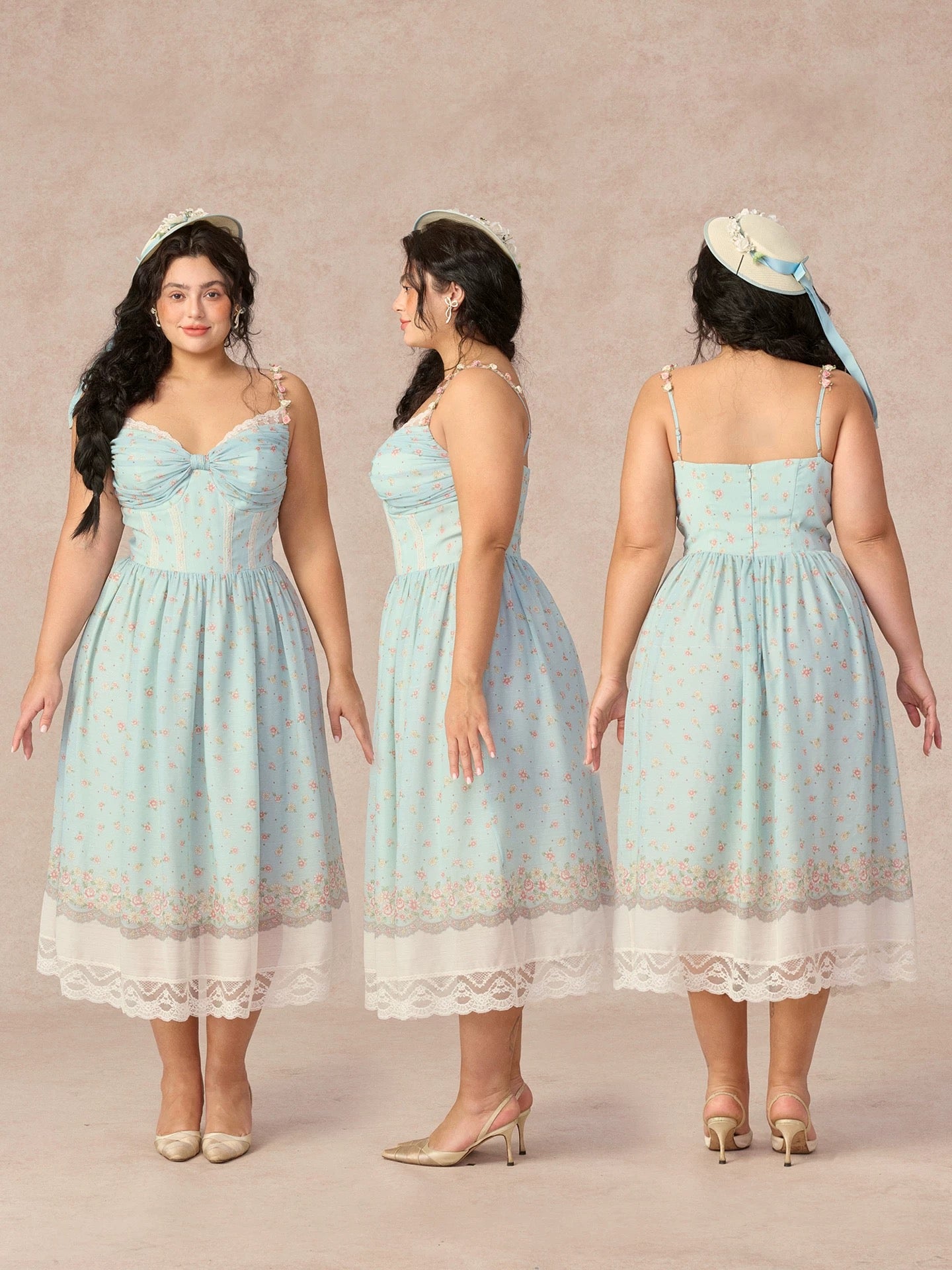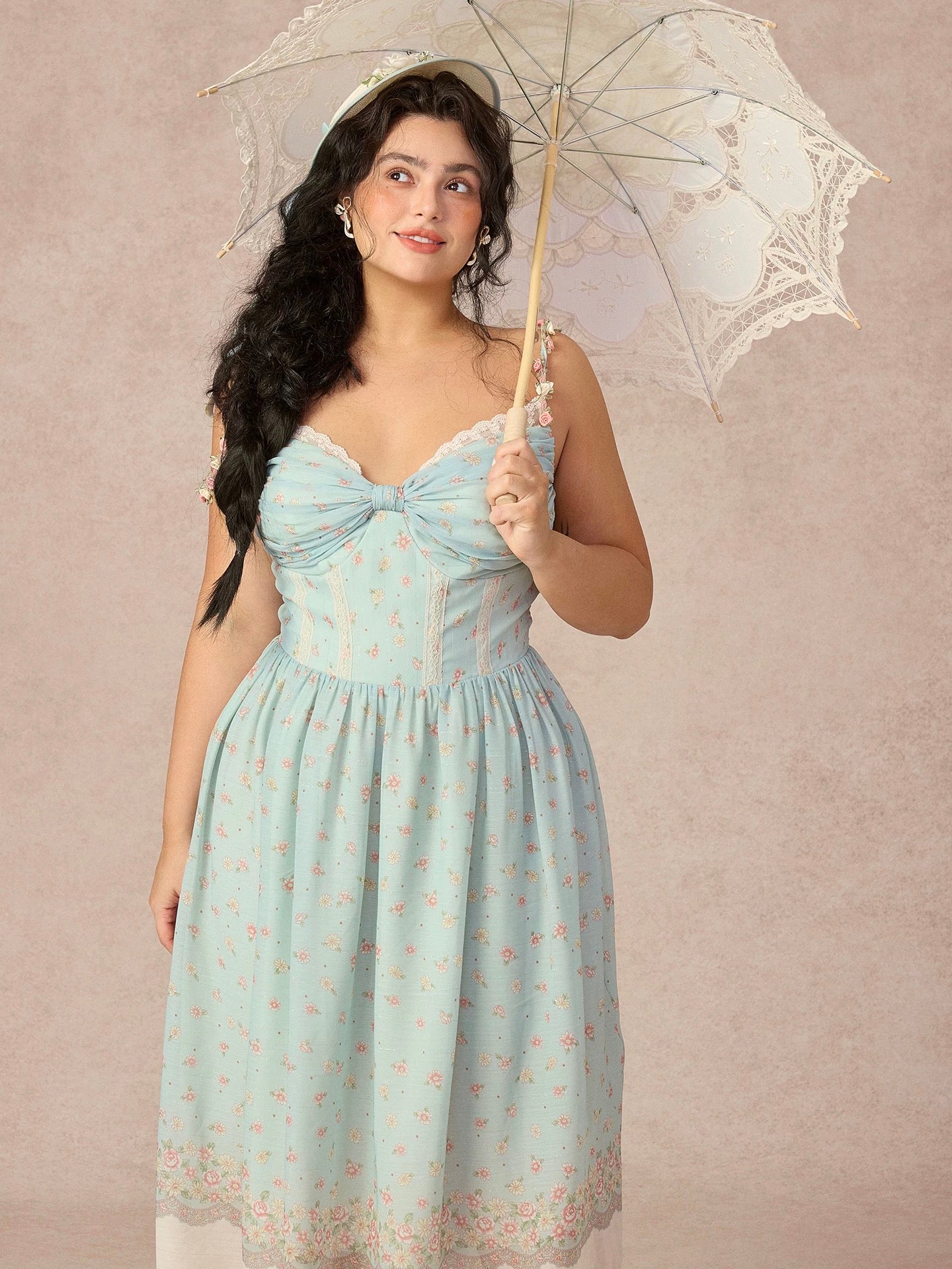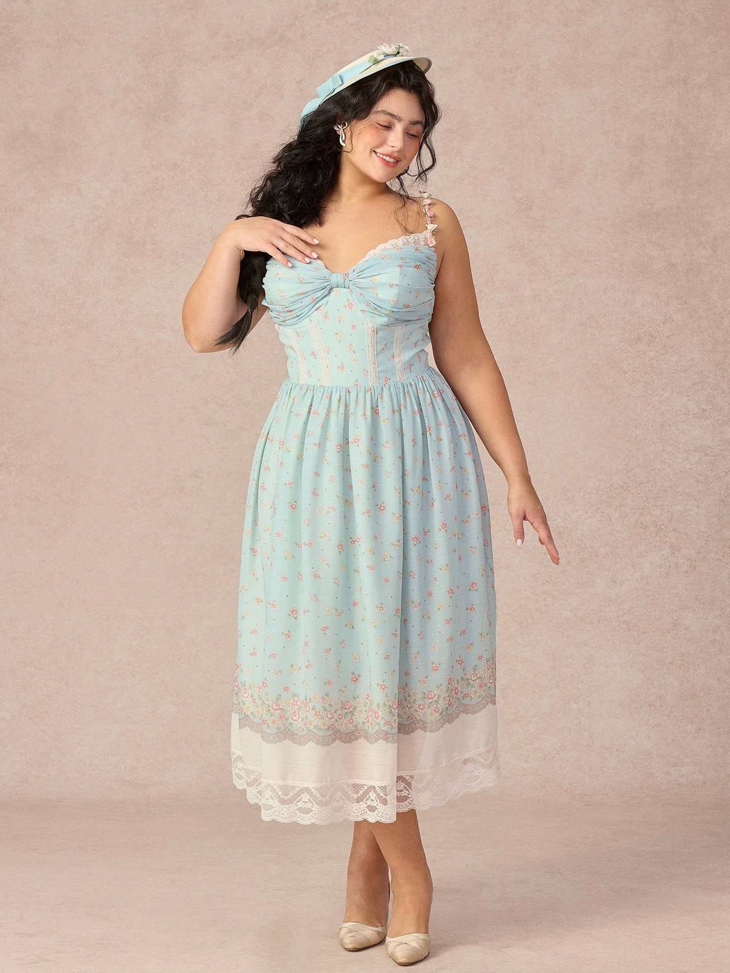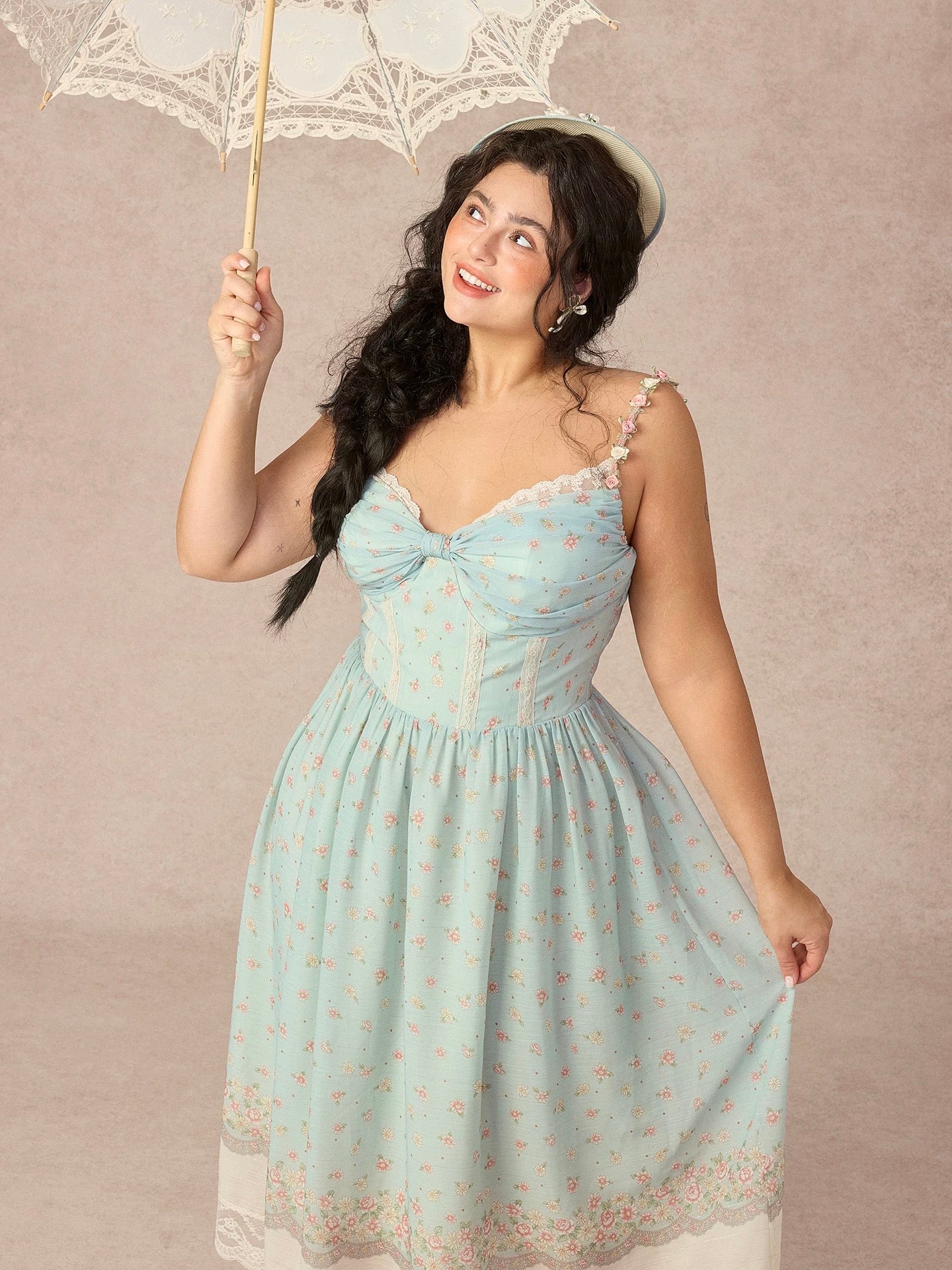 Designed in a soft sage floral with delicate scattered blooms, ‘Cottage Lyrica’ captures that nostalgic, lakeside-at-sunset kind of romance we can’t get enough of. The ruched butterfly bow at the bust is trimmed with lace for an extra touch of sweetness, while the corseted bodice is structured with vertical lace panels that sculpt and define the waist for that naturally cinched silhouette we love.