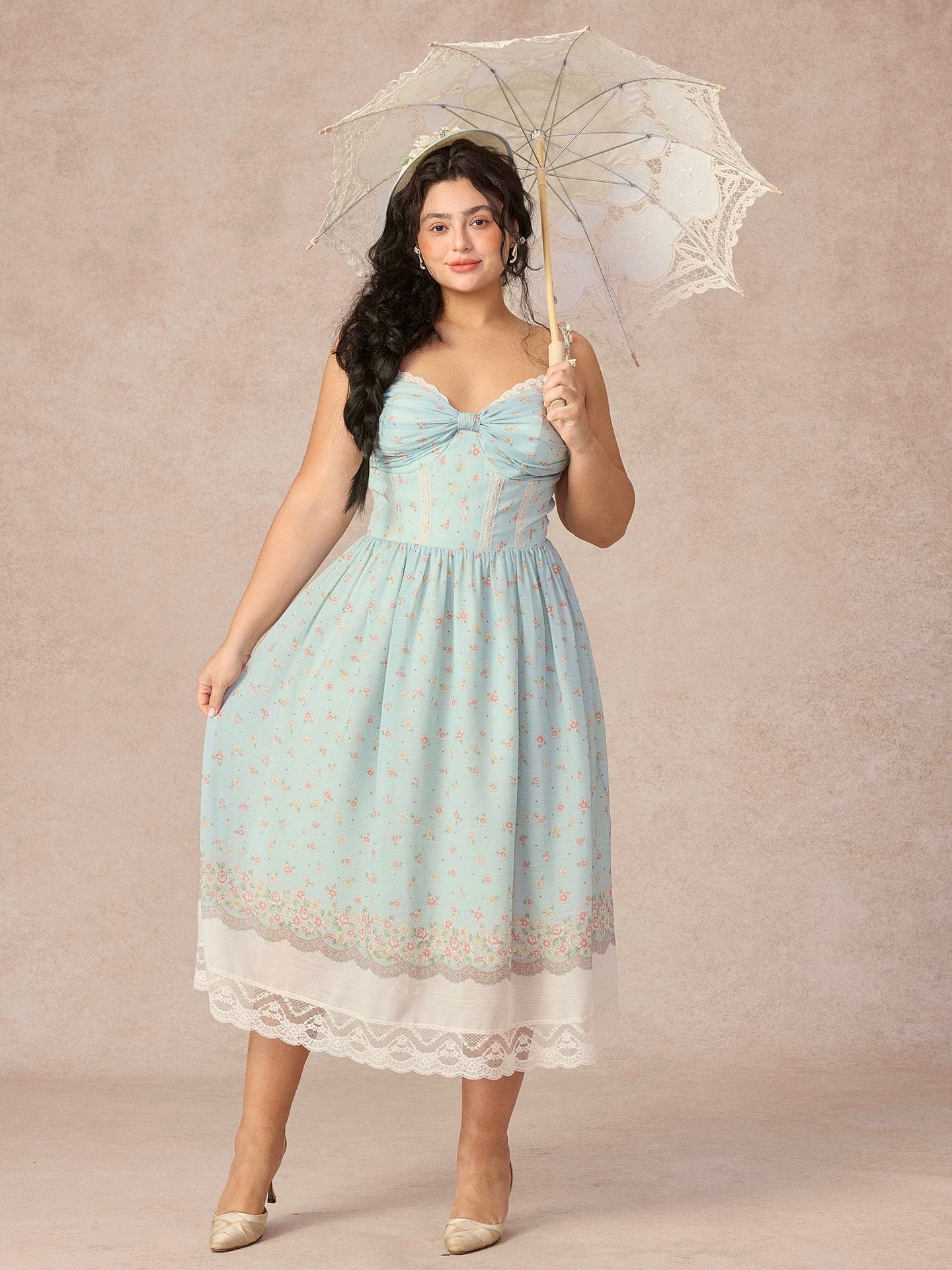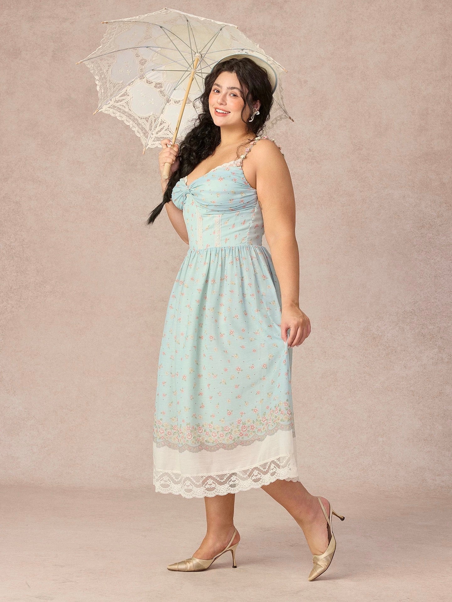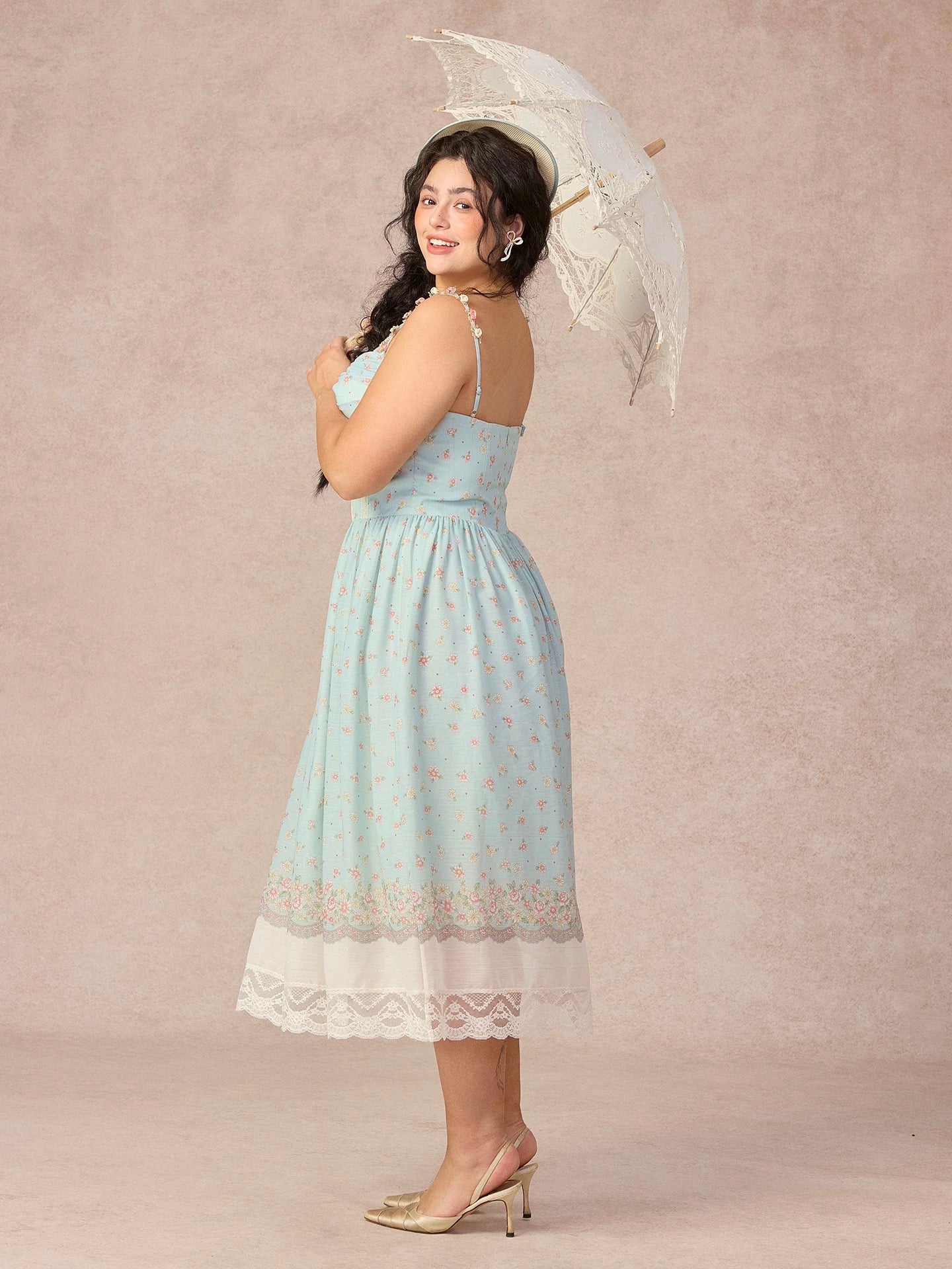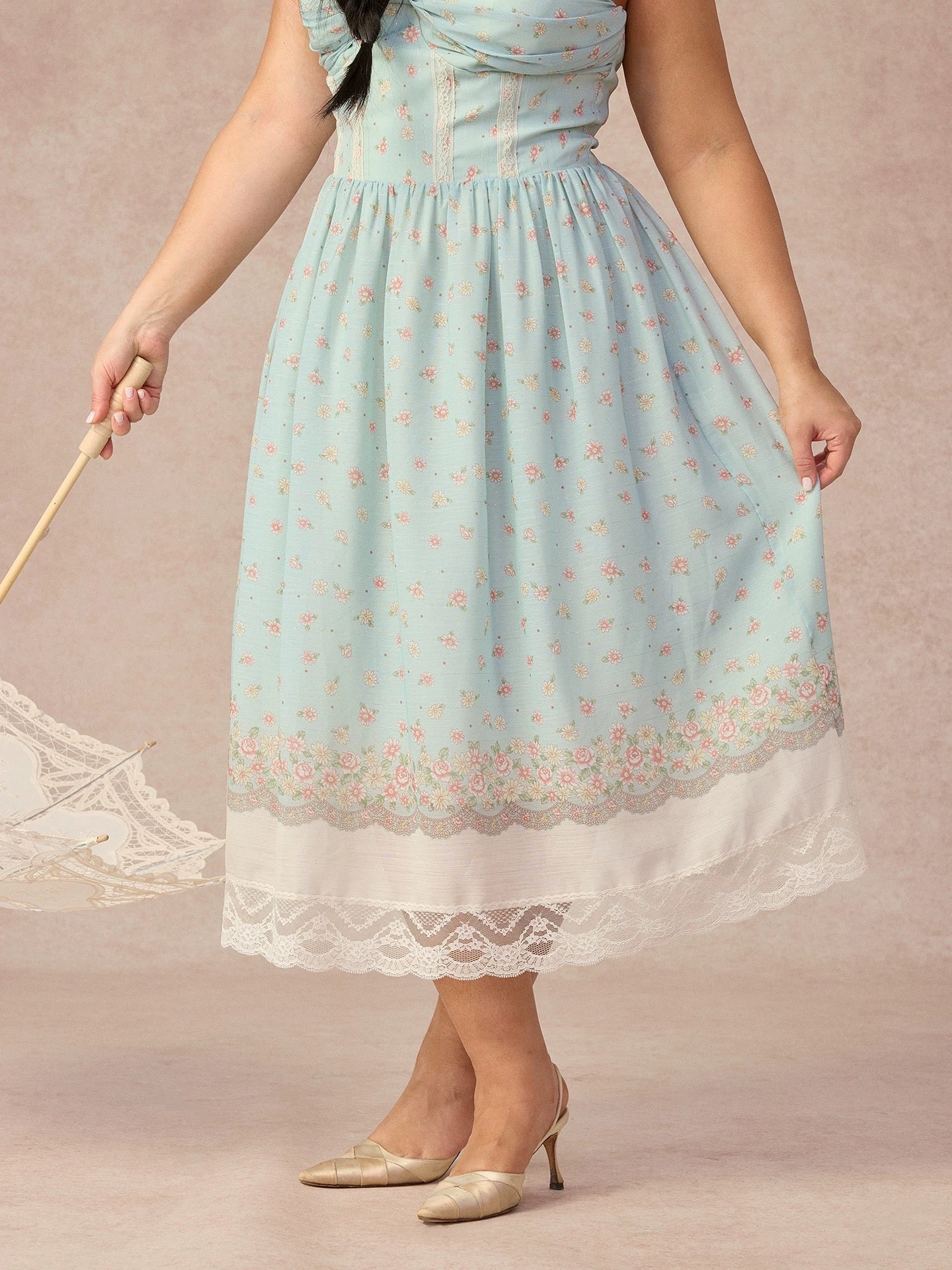 The skirt falls into a floaty, midi-length shape with a beautifully placed border print at the hem, finished with layered lace trimming that moves so softly with every step. It’s detailed, feminine, and quietly statement-making all at once.