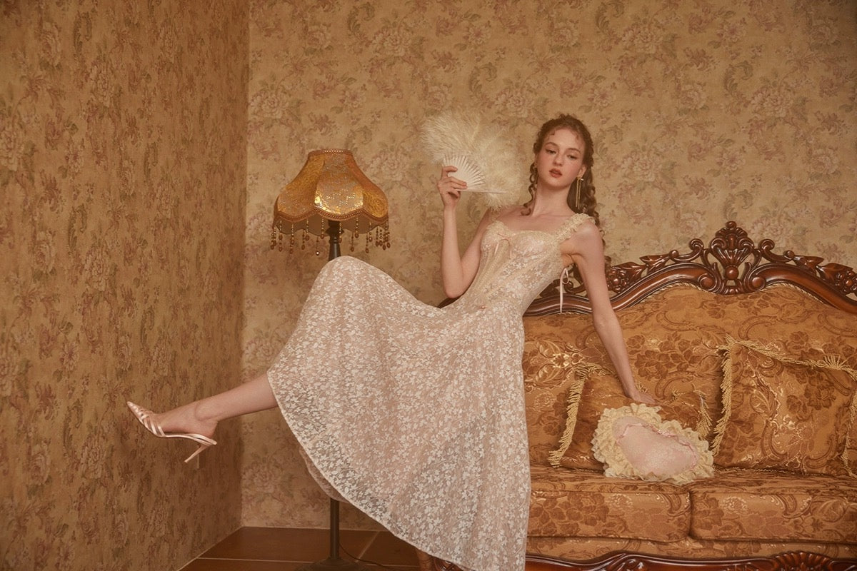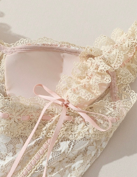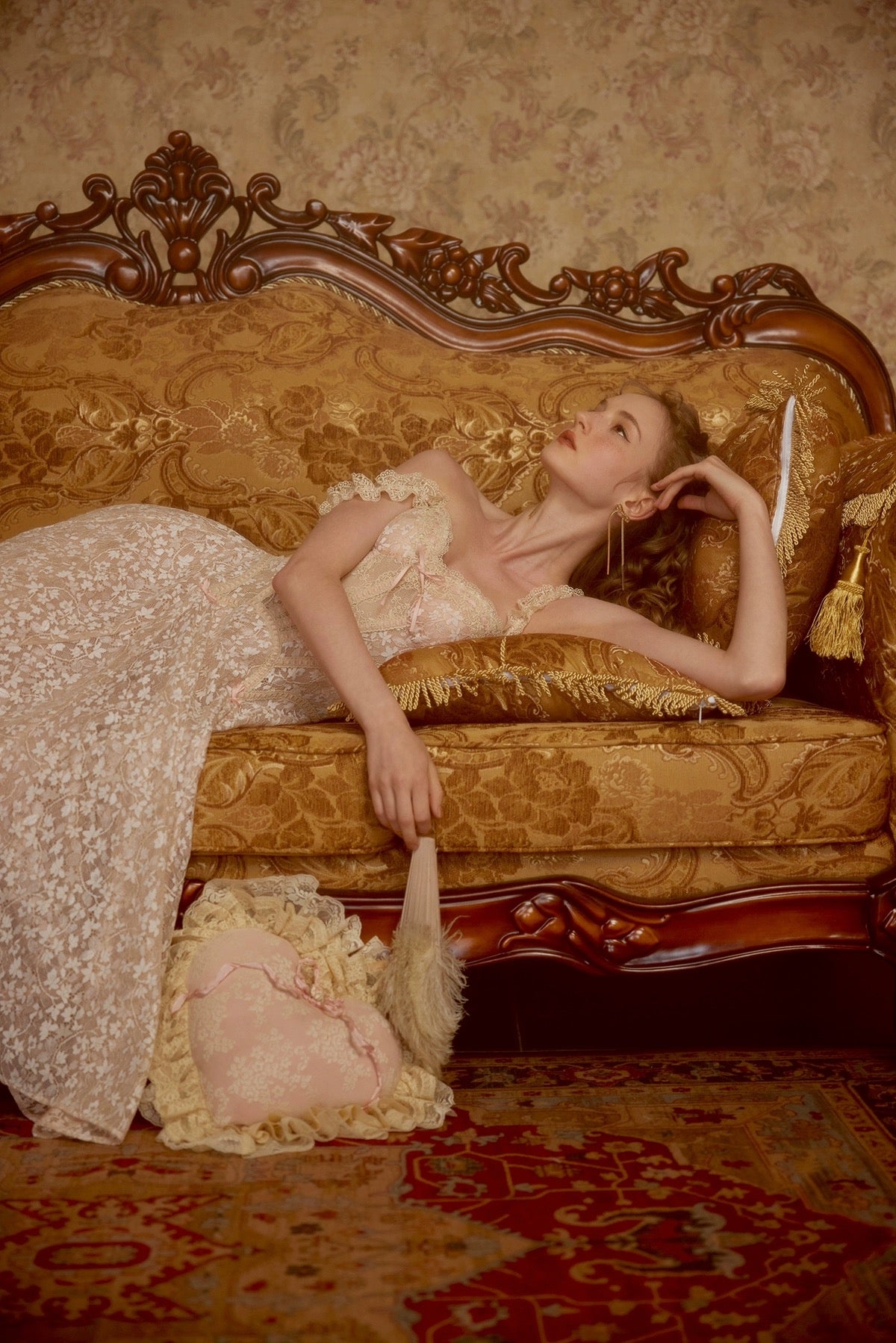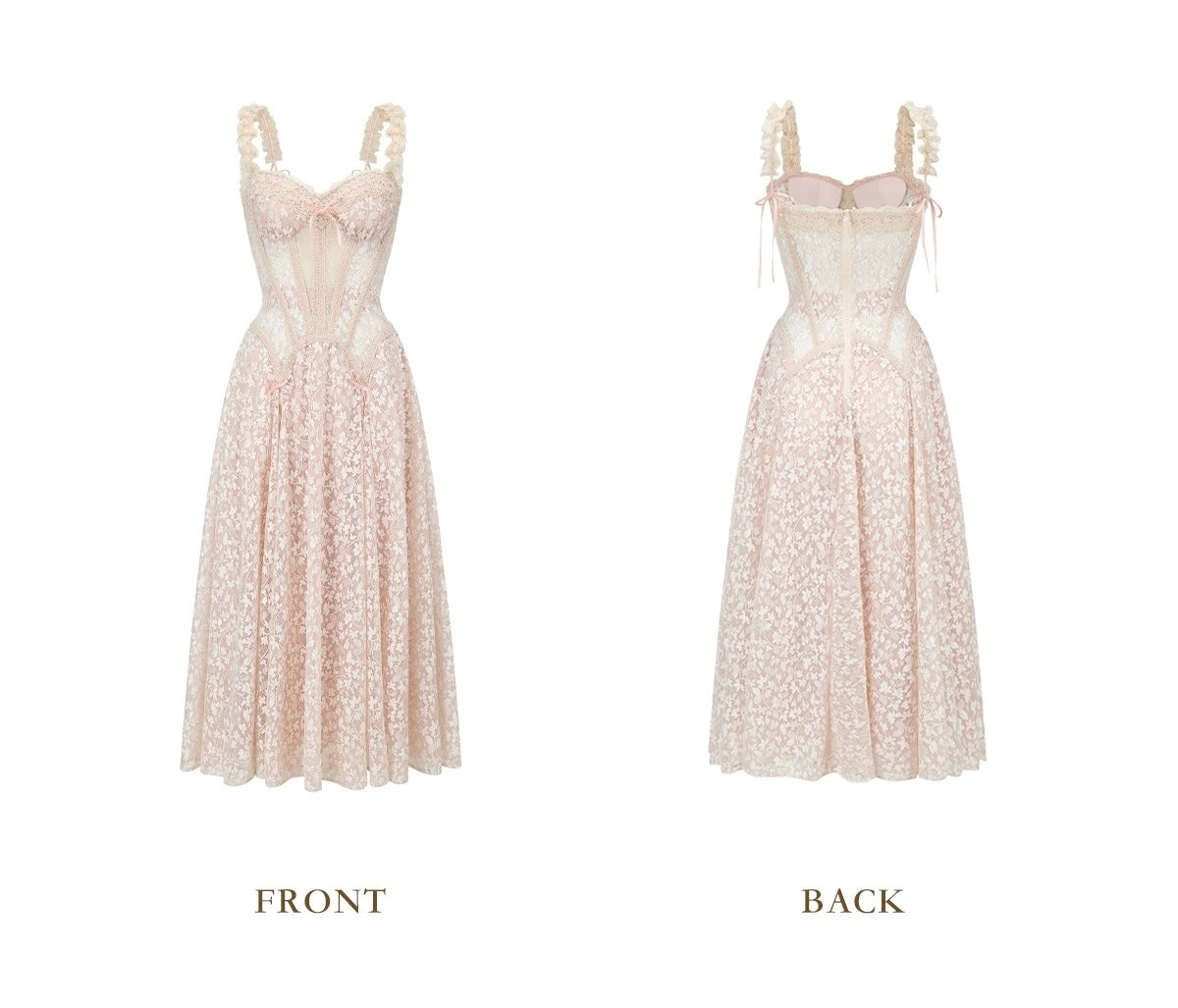 We used our signature fishbone design to sculpt and support the bodice, while adding intricate lace cutouts at the waist for a refined, 3D effect. The peach-heart neckline and molded cups naturally contour the bust, and the adjustable vintage lace straps add a playful touch. An asymmetric waistline flatters the shape, enhanced by a handmade bow for a sweet, feminine finish.