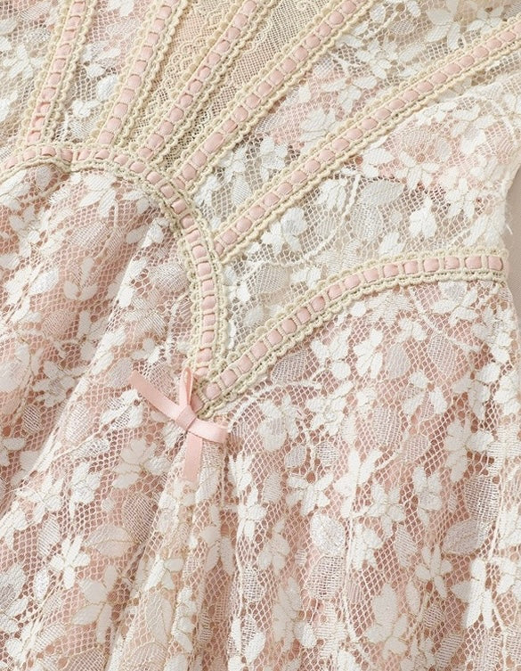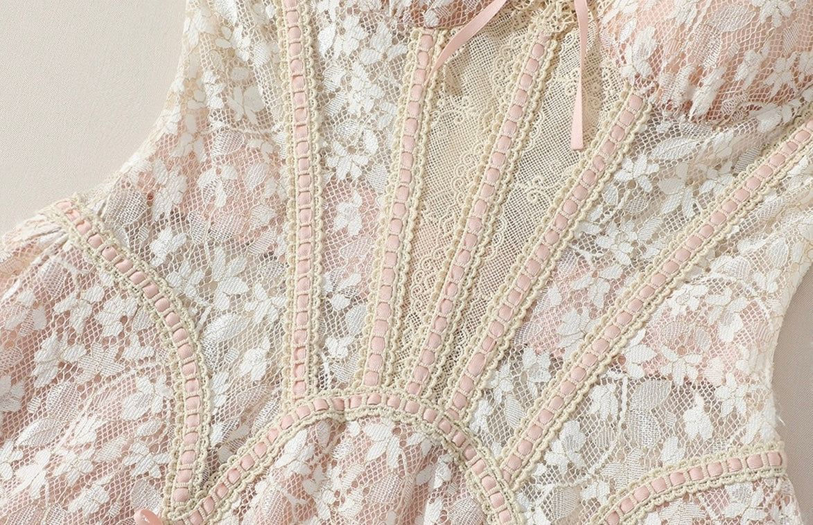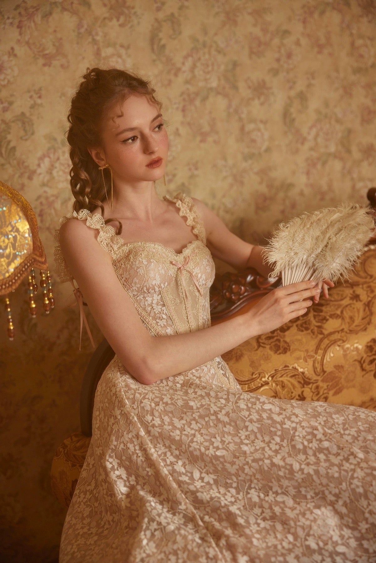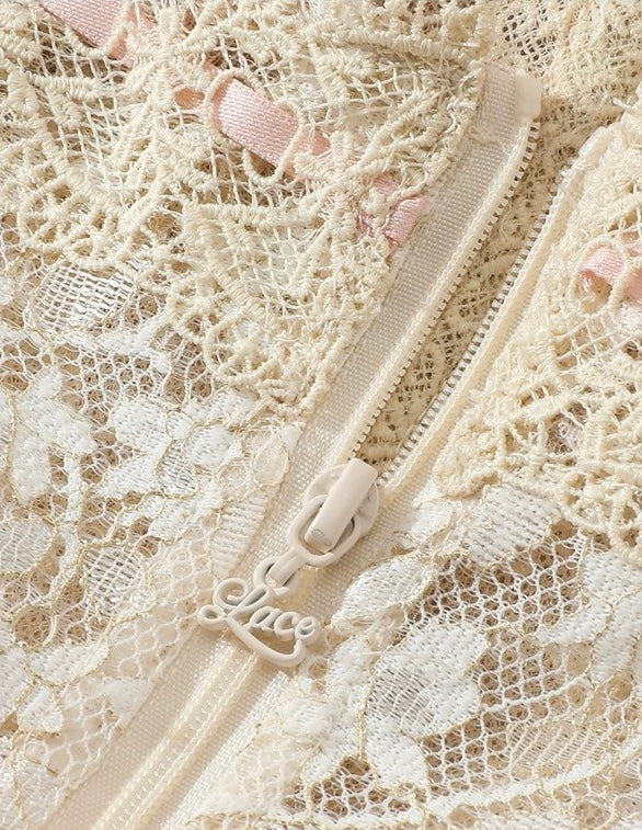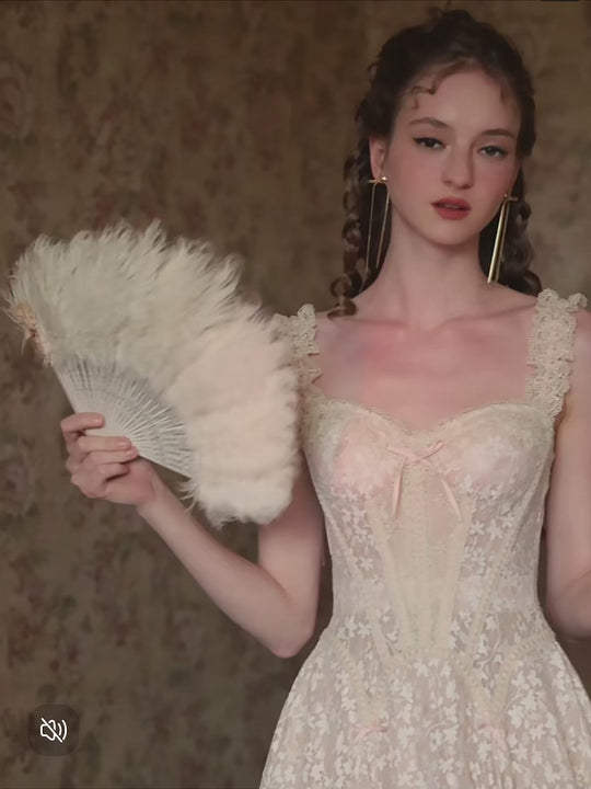 We used our signature fishbone design to sculpt and support the bodice, while adding intricate lace cutouts at the waist for a refined, 3D effect. The peach-heart neckline and molded cups naturally contour the bust, and the adjustable vintage lace straps add a playful touch. An asymmetric waistline flatters the shape, enhanced by a handmade bow for a sweet, feminine finish.