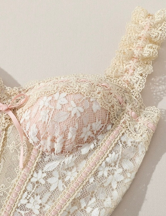 The Fredalena is delicate, dreamy, and full of thoughtful detail—crafted for those who love elegance with a sweet twist. Crafted from fine-thread gold lace with a silky, smooth texture, it’s paired with a soft, breathable knit lining for comfort and security.