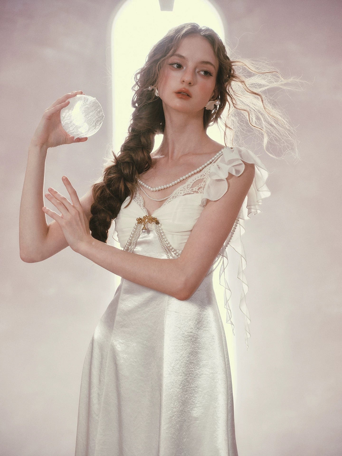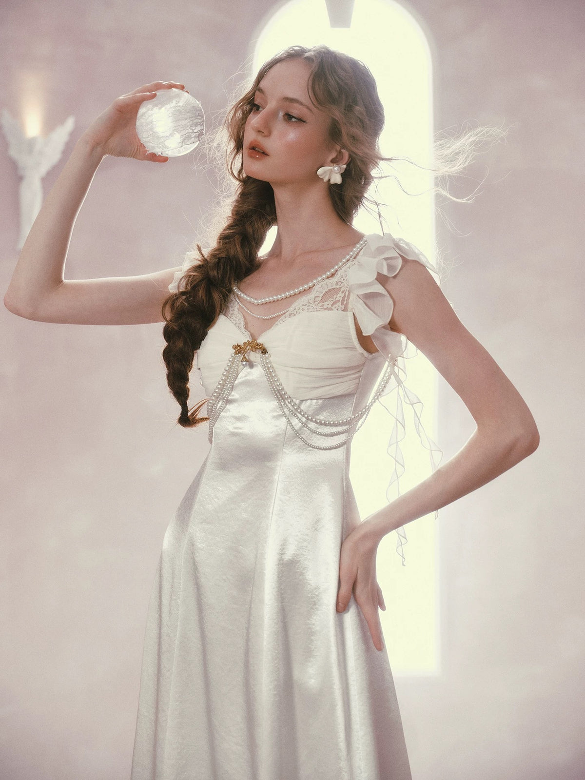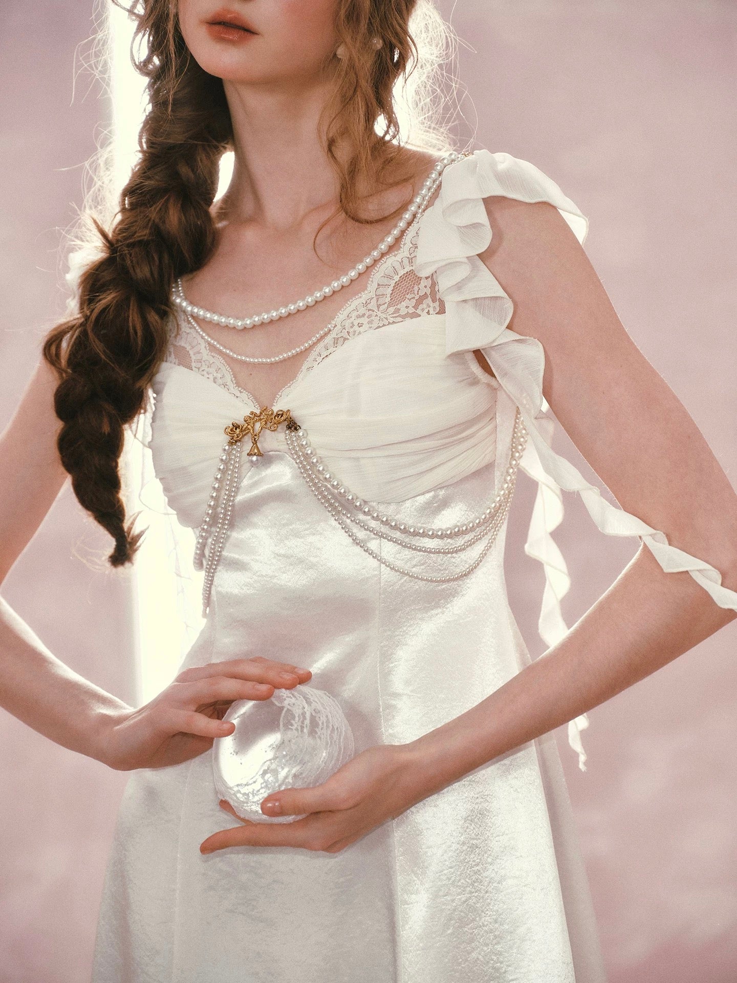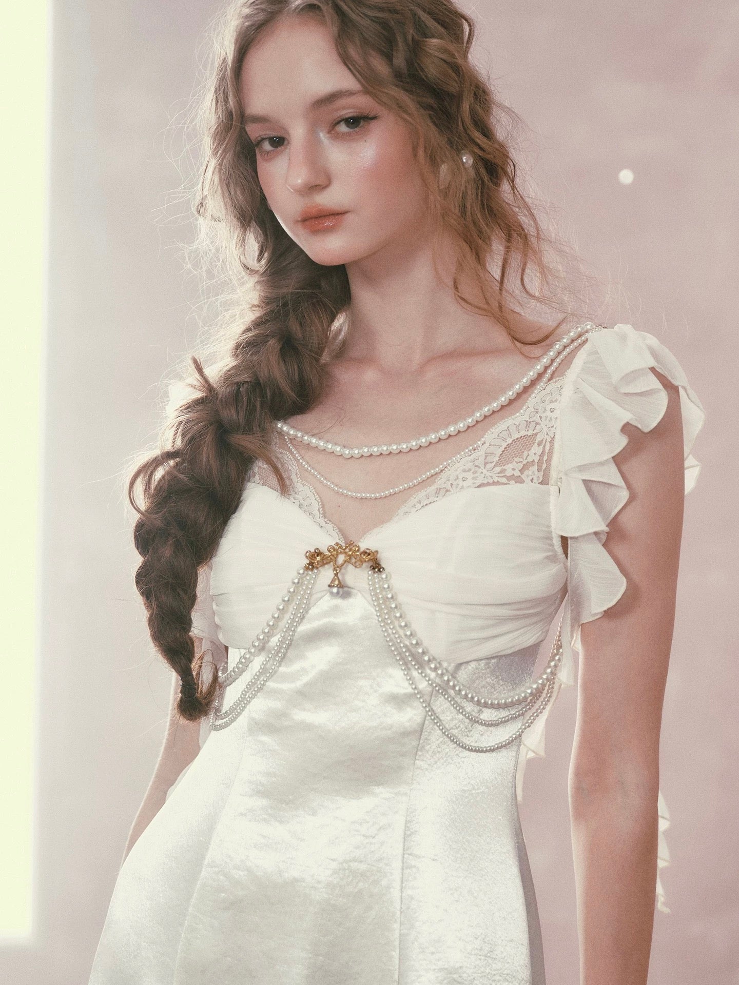 Cut from luminous satin with a soft sheen, ‘Moonlit Regalia’ glows with every step. The bodice is gently ruched to create depth and dimension across the bust, framed with delicate lace and layered pearl chains that drape like heirloom jewelry. A gold-toned brooch anchors the neckline, drawing the eye and adding that regal, vintage touch we adore.