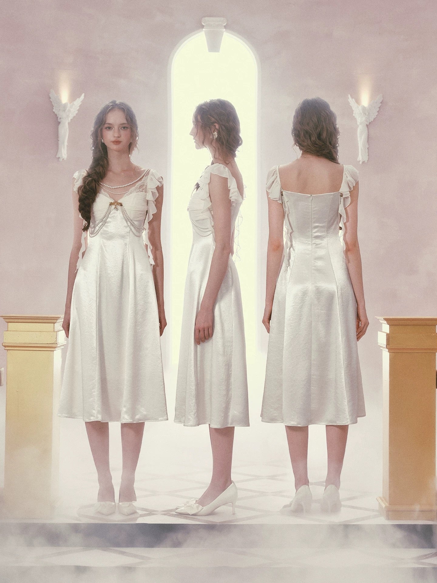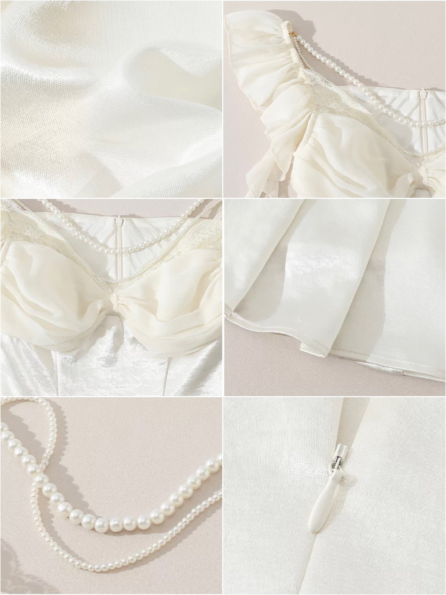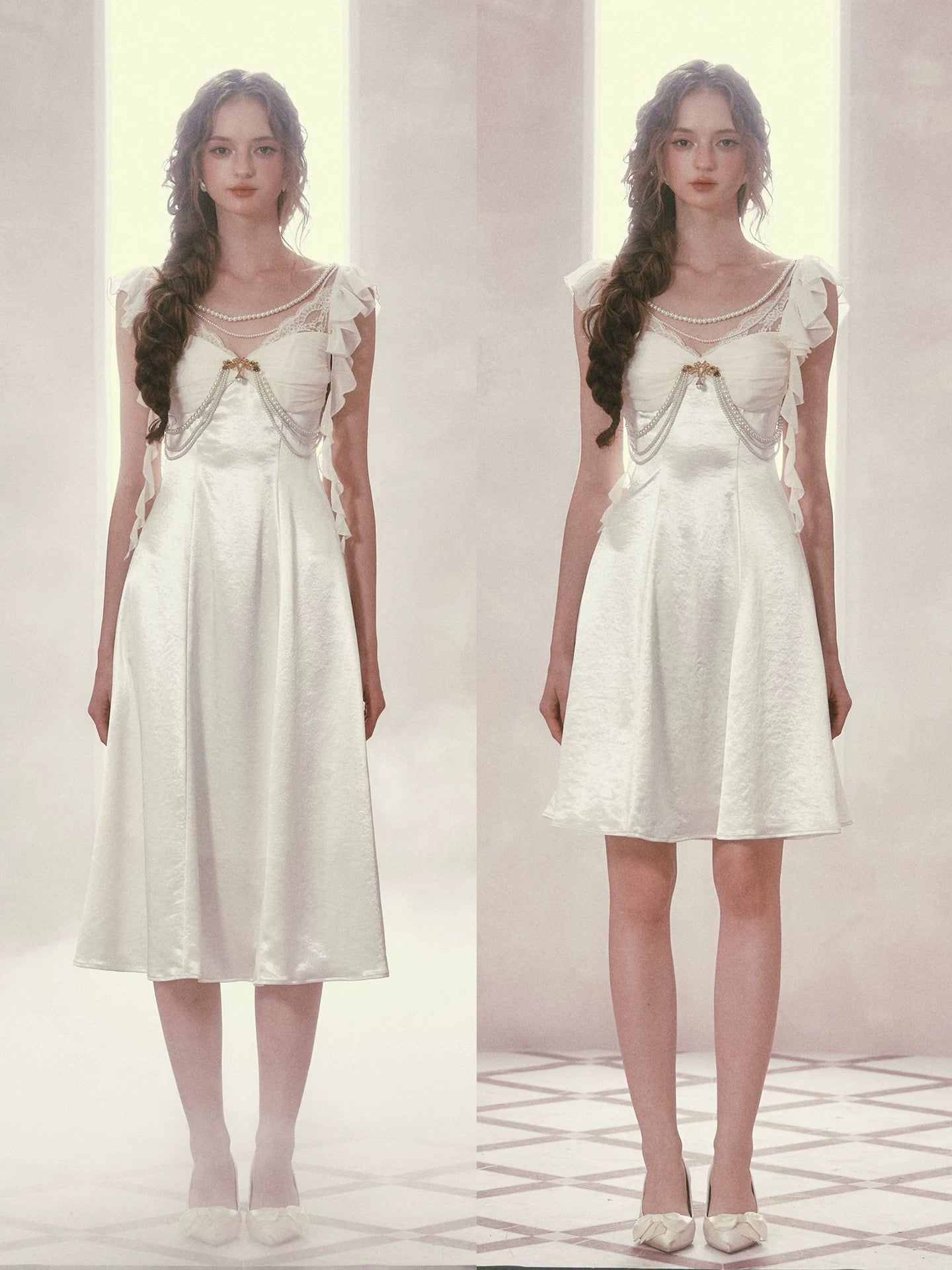 Cut from luminous satin with a soft sheen, ‘Moonlit Regalia’ glows with every step. The bodice is gently ruched to create depth and dimension across the bust, framed with delicate lace and layered pearl chains that drape like heirloom jewelry. A gold-toned brooch anchors the neckline, drawing the eye and adding that regal, vintage touch we adore.