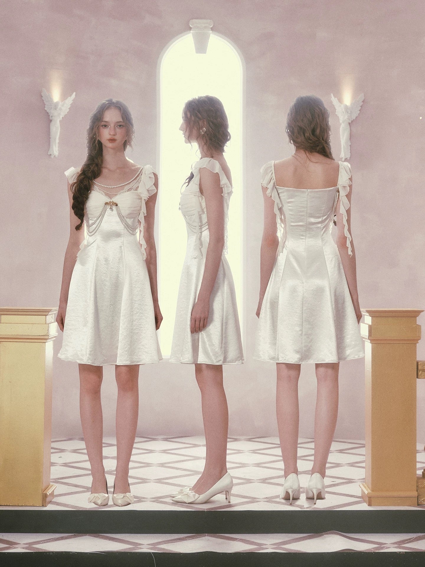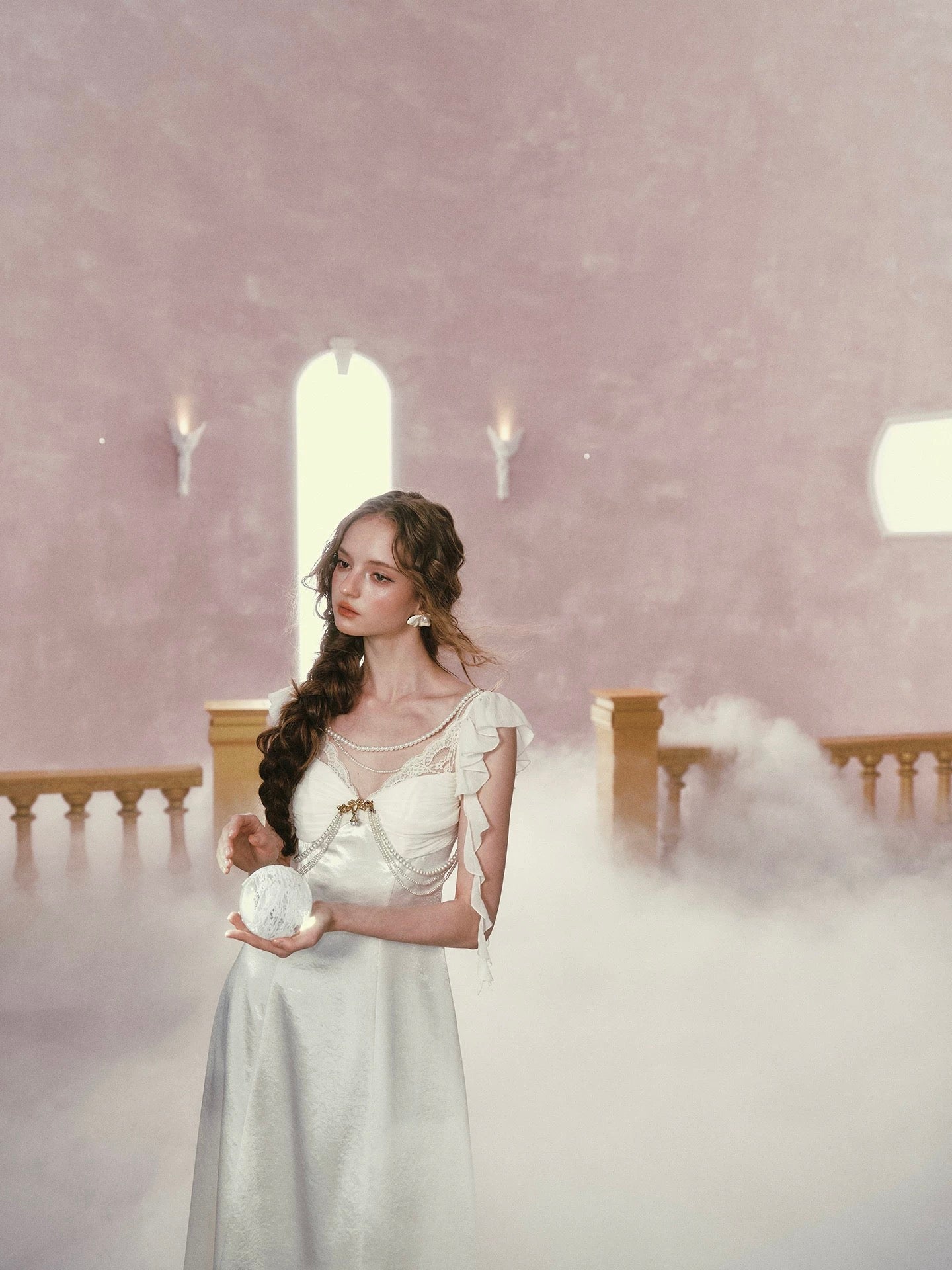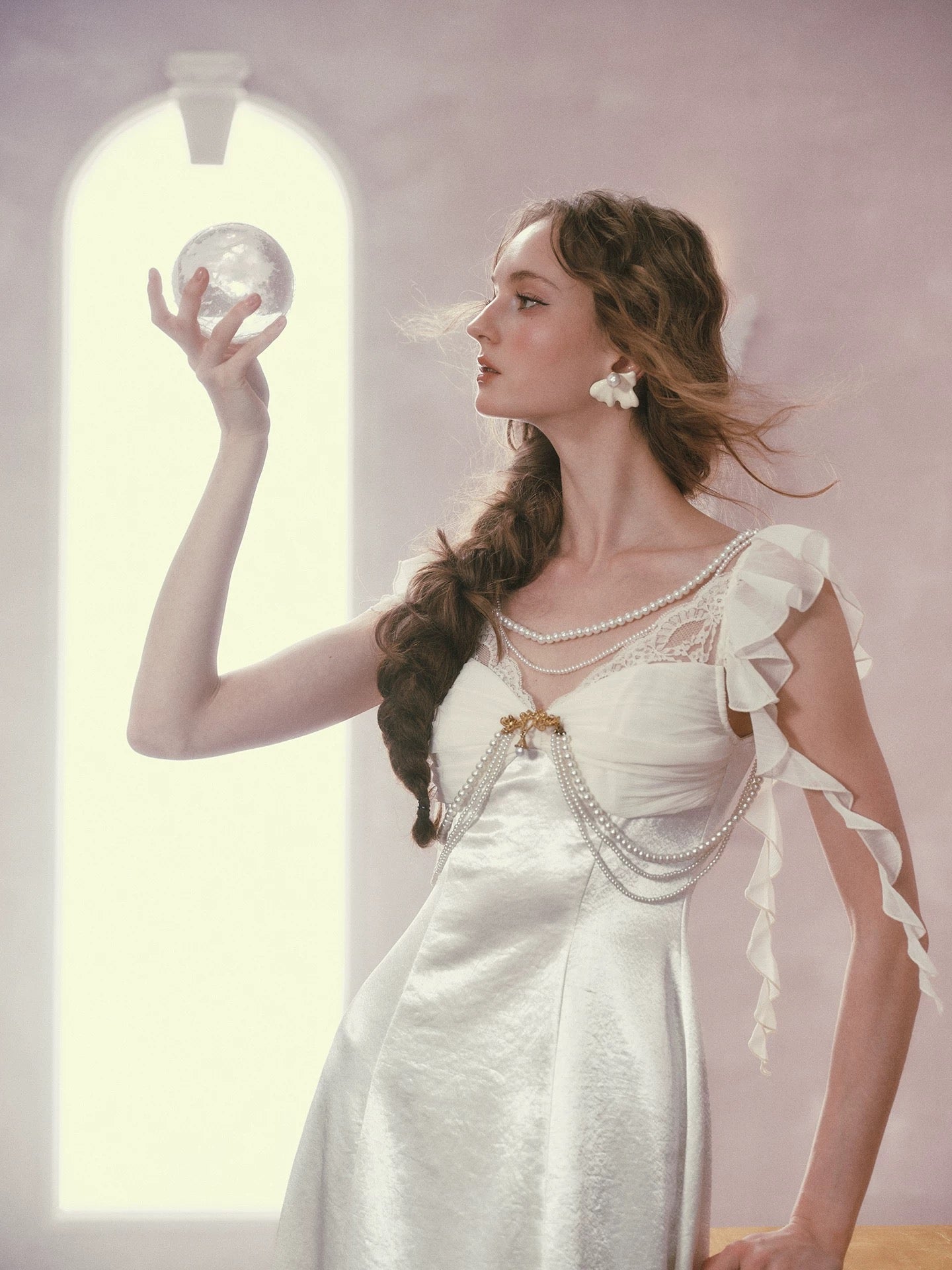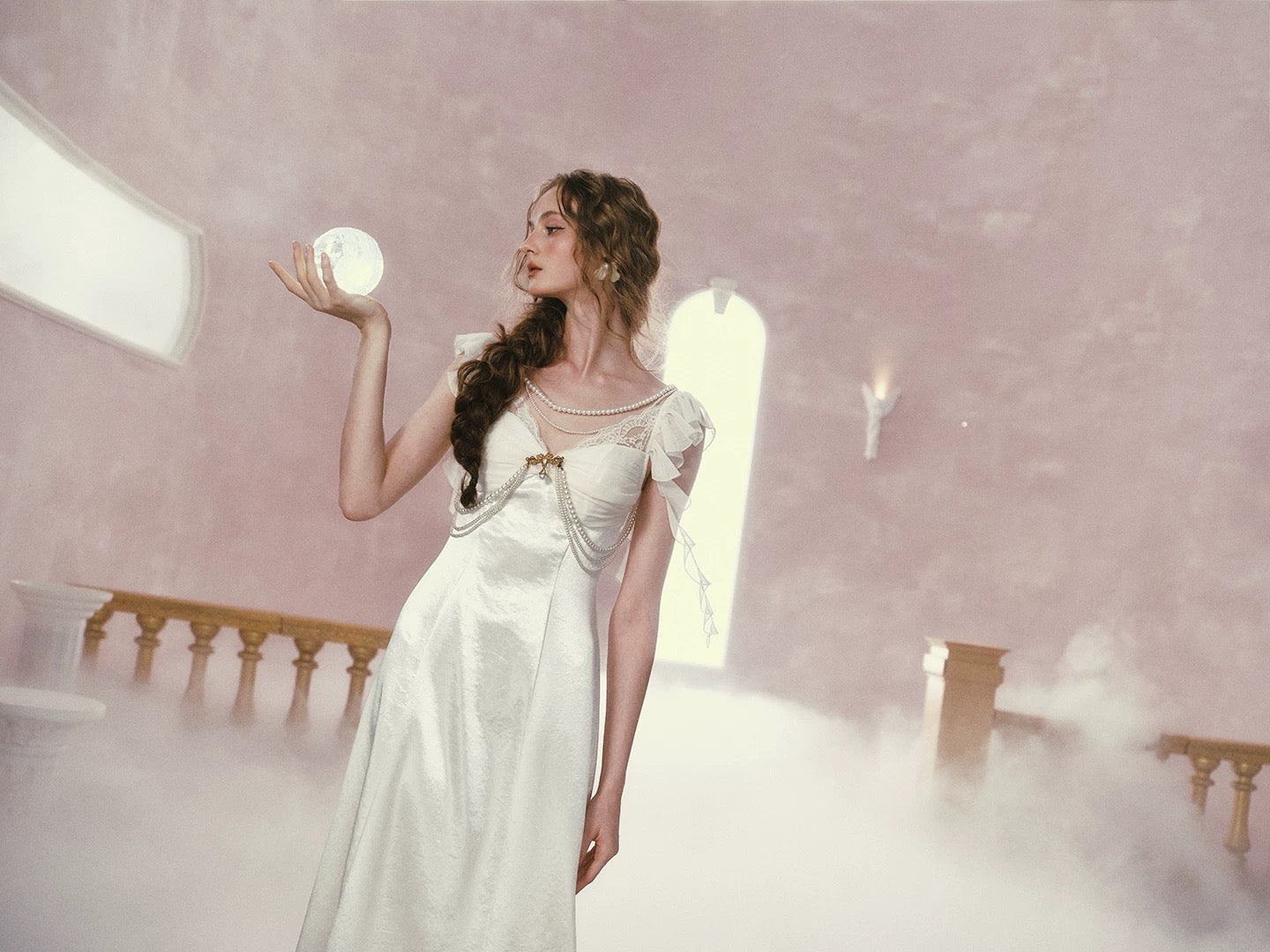 Cut from luminous satin with a soft sheen, ‘Moonlit Regalia’ glows with every step. The bodice is gently ruched to create depth and dimension across the bust, framed with delicate lace and layered pearl chains that drape like heirloom jewelry. A gold-toned brooch anchors the neckline, drawing the eye and adding that regal, vintage touch we adore.