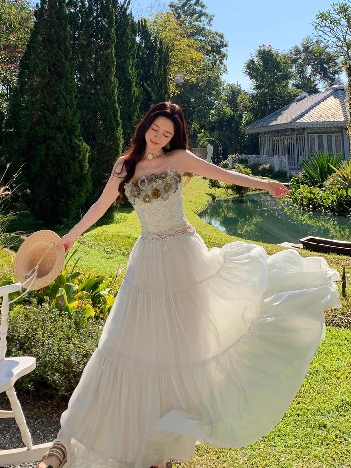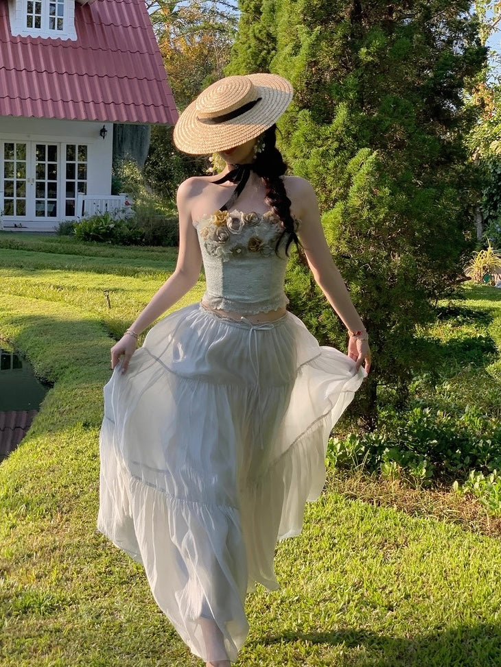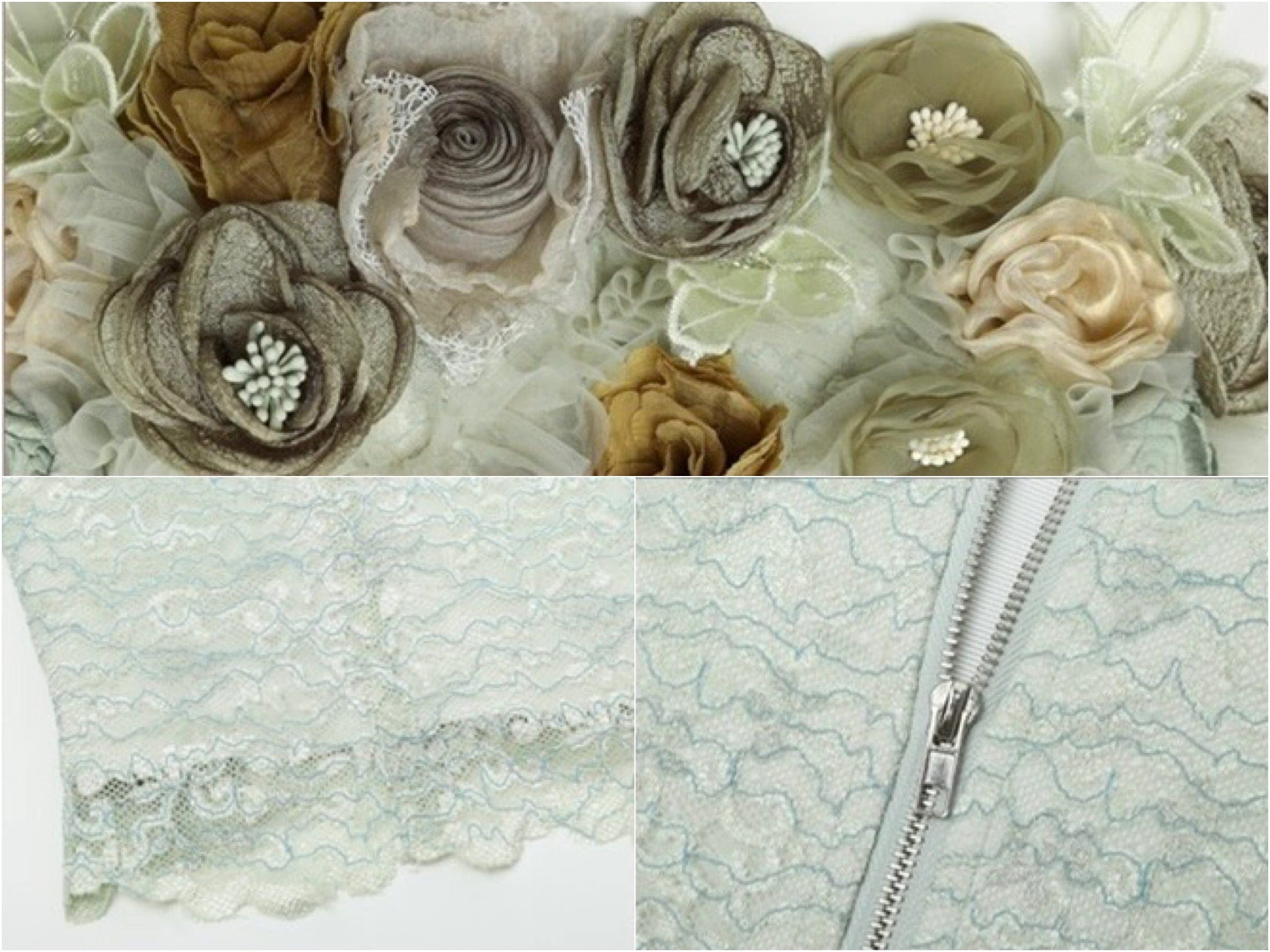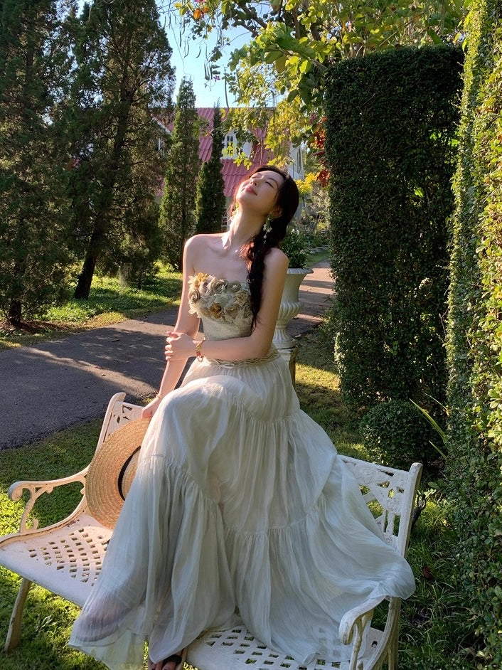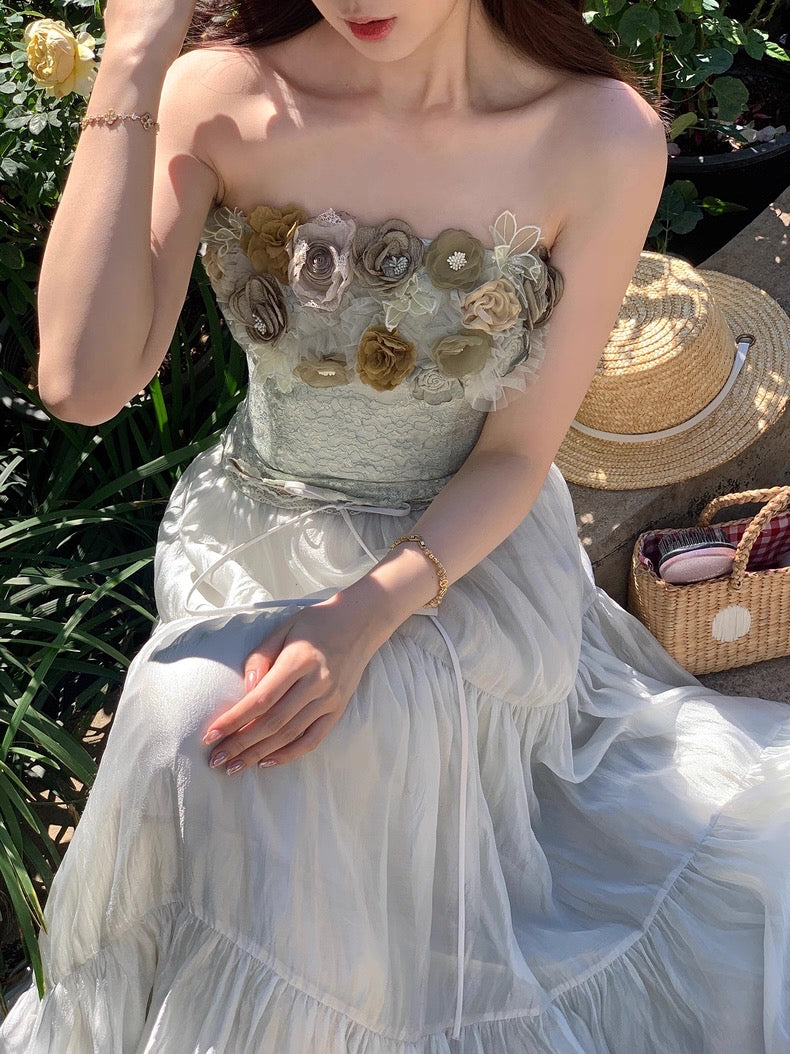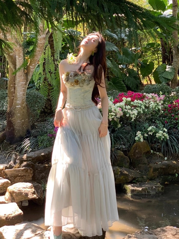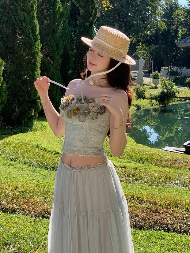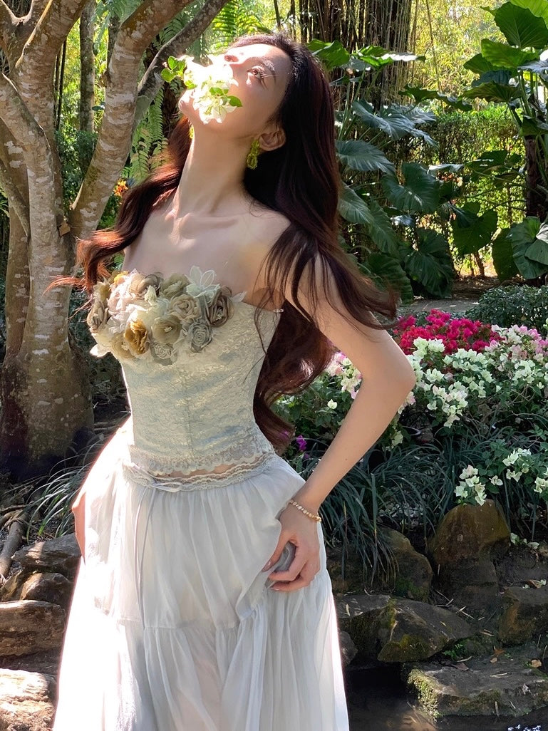 Crafted from selected imported nylon lace with a subtle pearlescent glow, the bandeau corset is cut to sculpt and define the waist with a close, feminine fit that traces every curve so beautifully. The lace hem is precisely positioned and delicately scalloped, while hand-applied tonal green florals bloom across the neckline, layered in varying depths of sage and moss for a rich, dimensional finish. Sheer mesh weaves between each blossom, creating that airy, light-catching texture that feels romantic and alive.