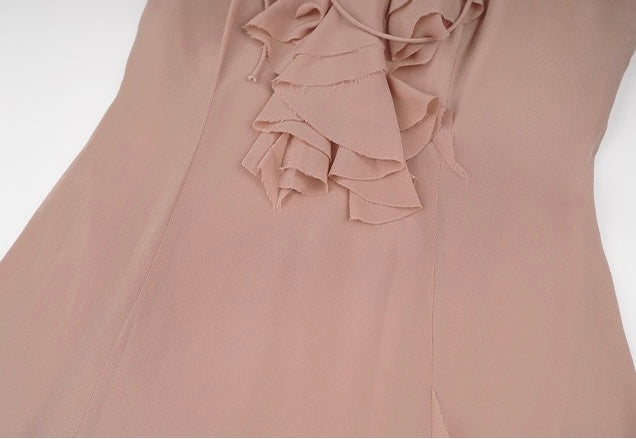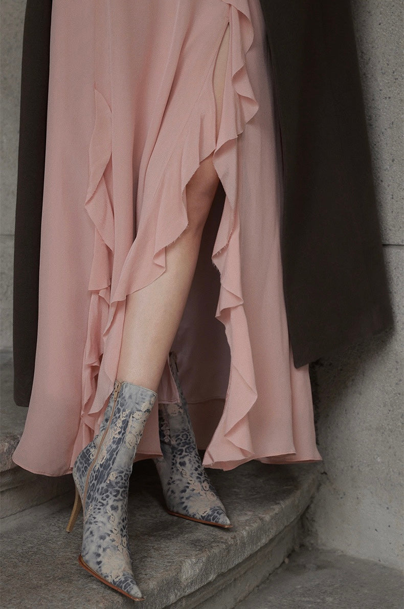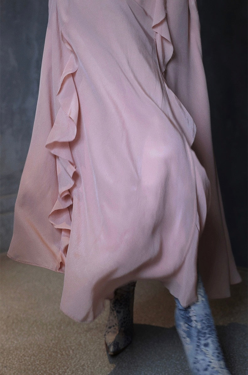 Cut from lightweight viscose chiffon with a silky lining, the fabric has that dreamy drape and soft texture that moves with every step. The asymmetrical hemline is finished with layered ruffle trims, cut with precision for a petal-like flutter that sways like a midnight bloom.