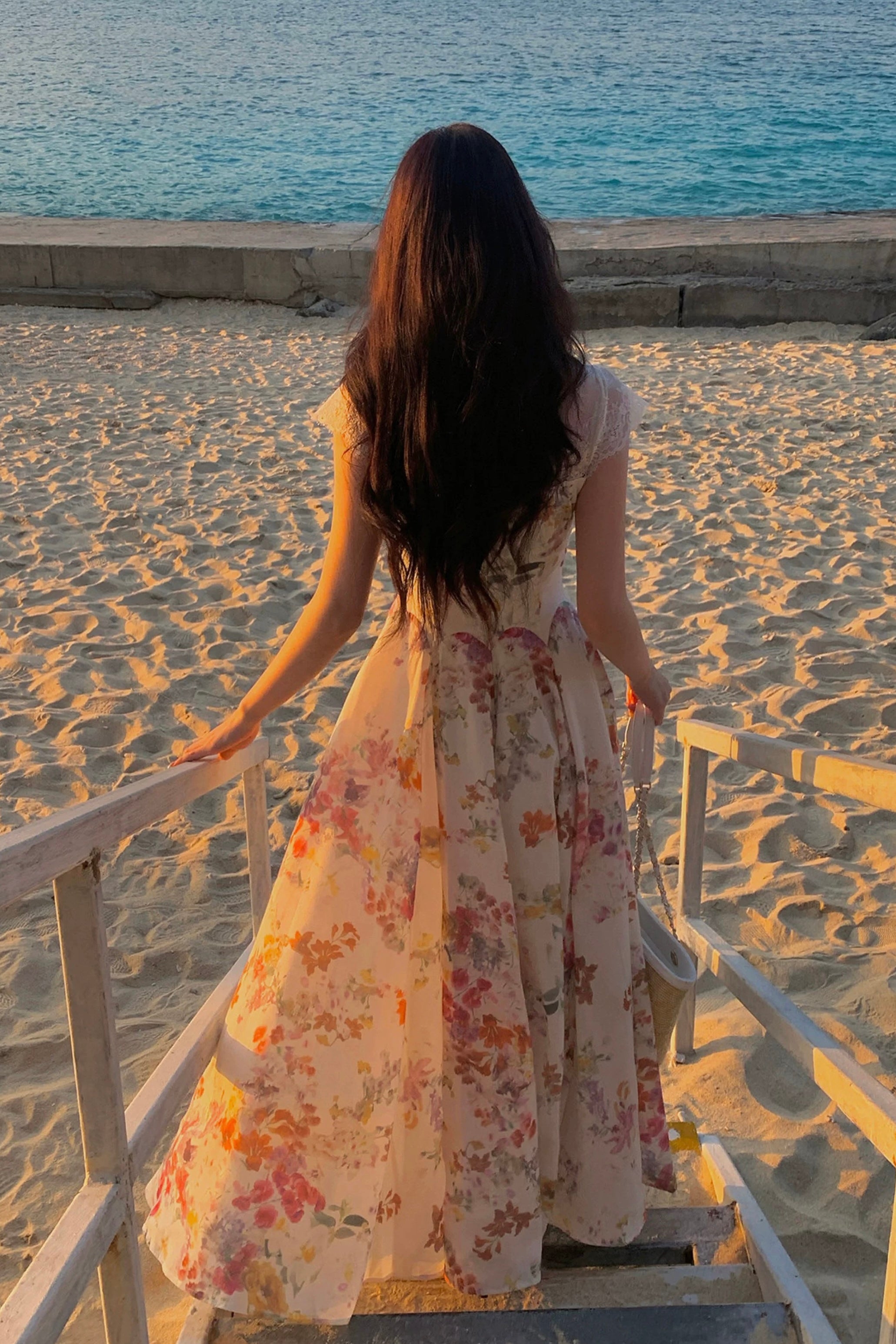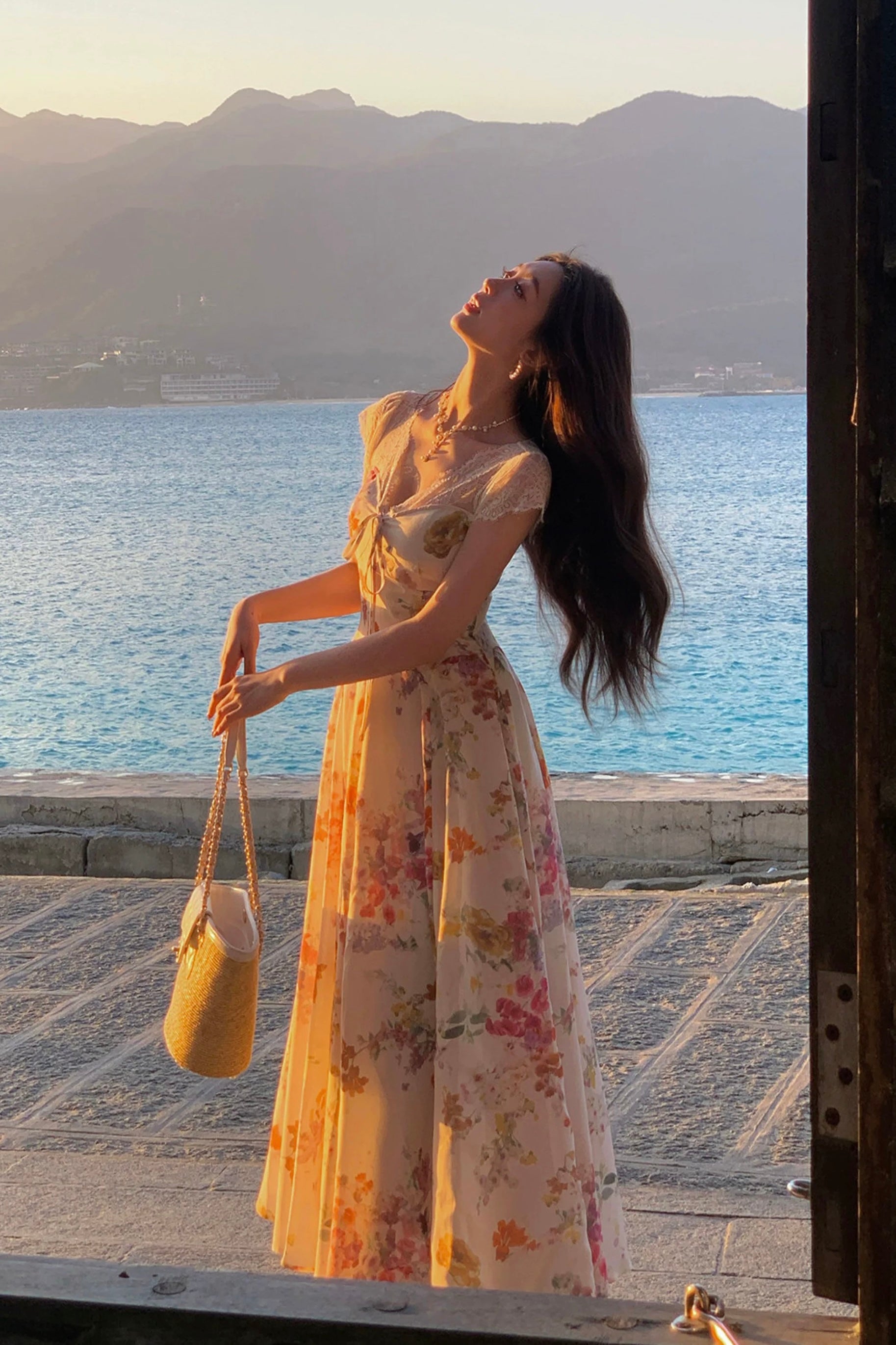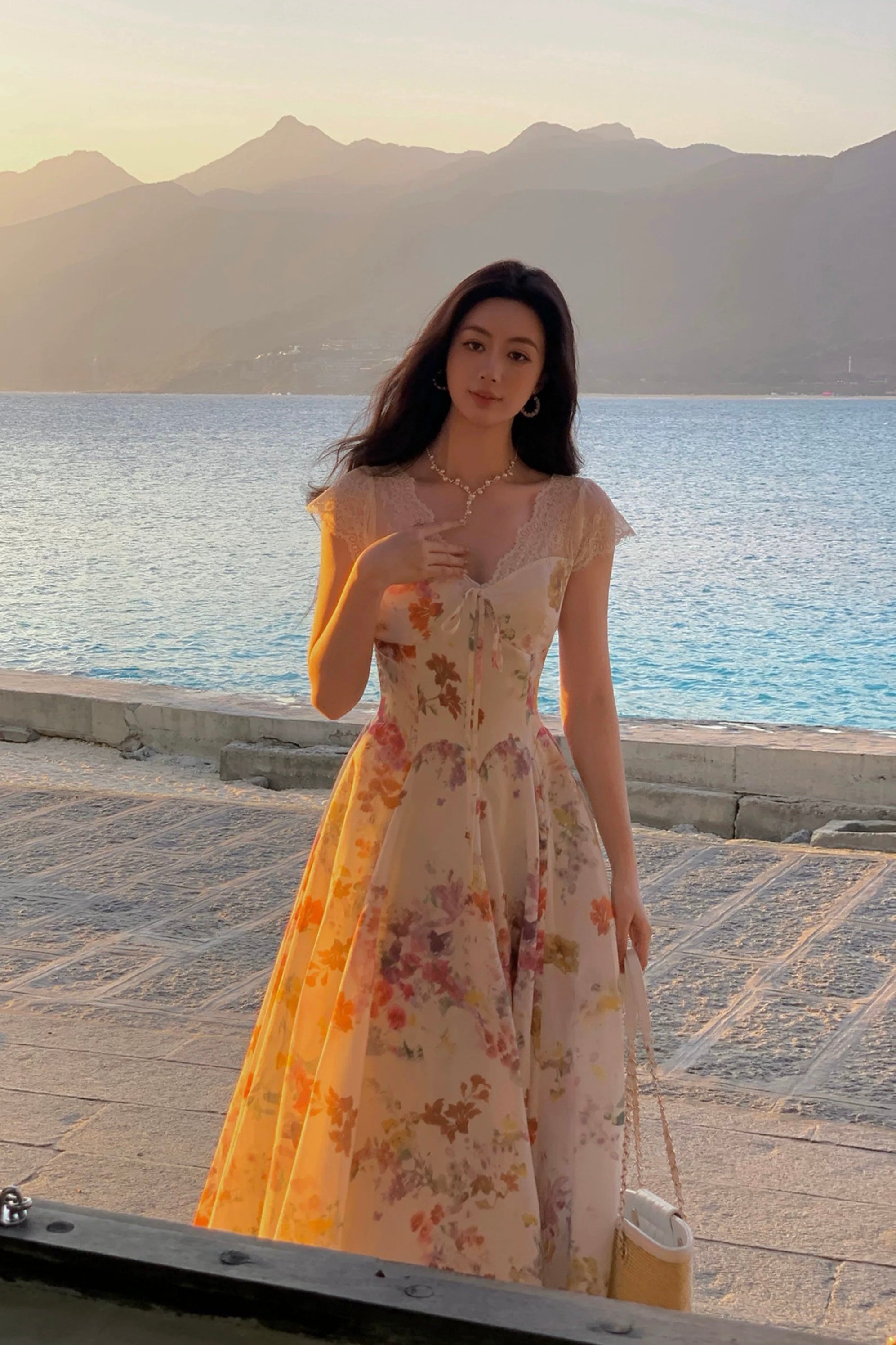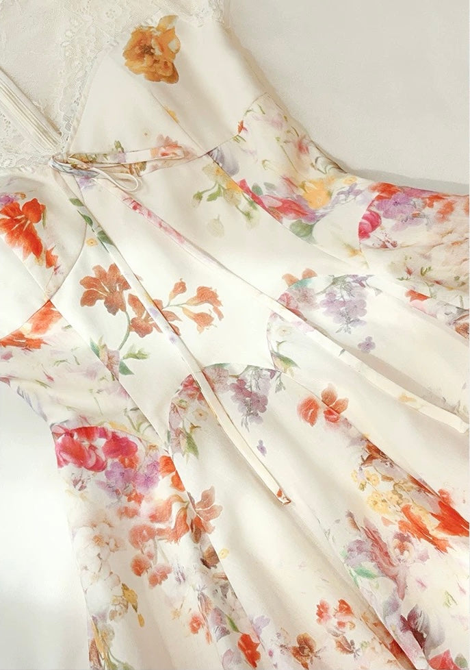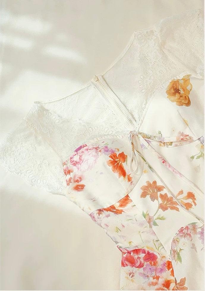 The delicate cap sleeves are paired with lace panel detailing, and the scalloped lace edges fall gently over the shoulders like petals in early spring, refining the shoulder line while adding that soft, feminine touch and avoiding the bareness of a sleeveless cut. The V neckline with its adjustable tie detail subtly frames the face and draws the eye inward, balancing sweetness with structure.