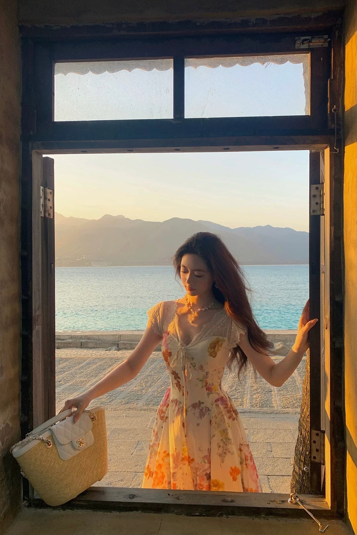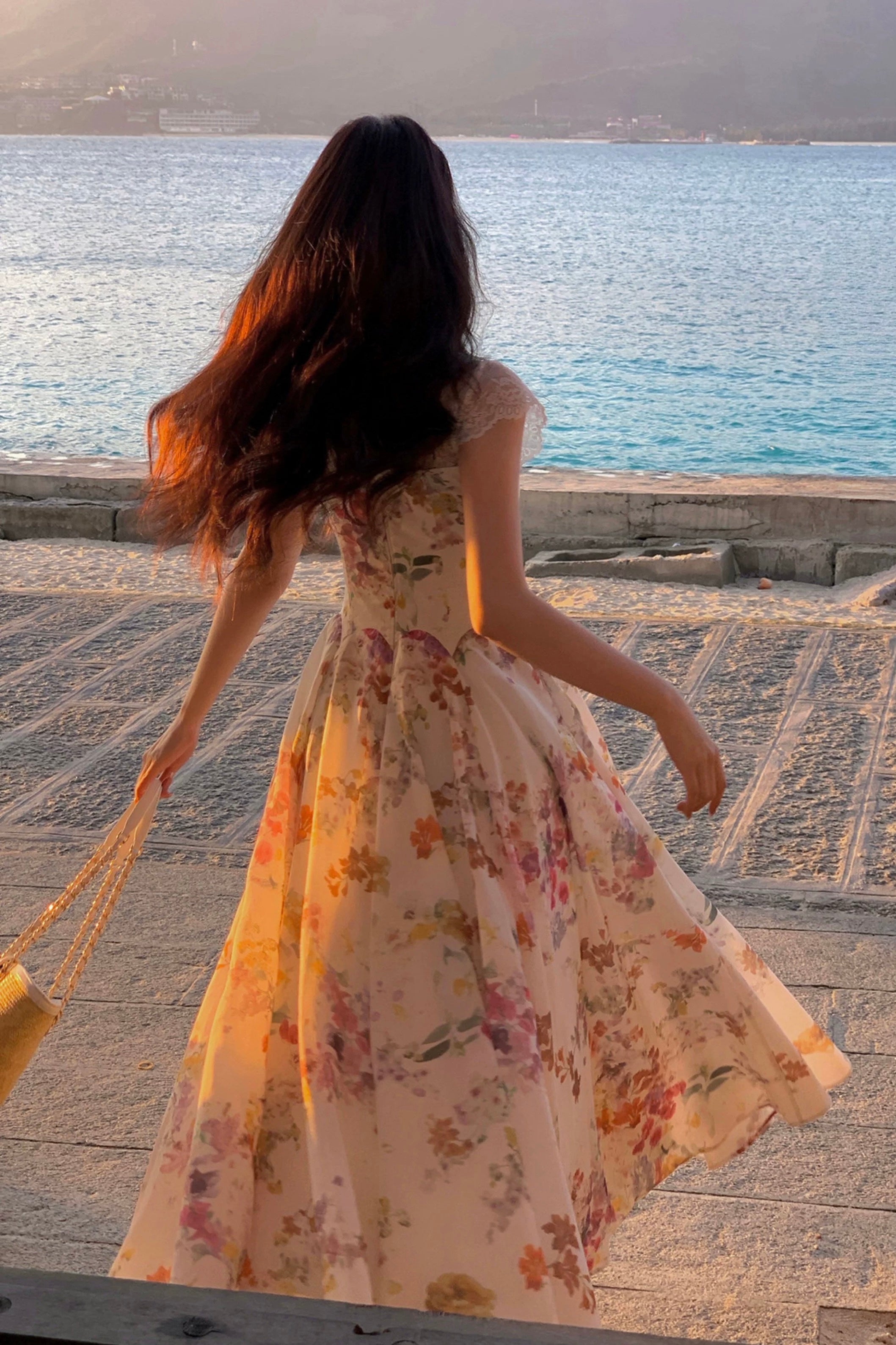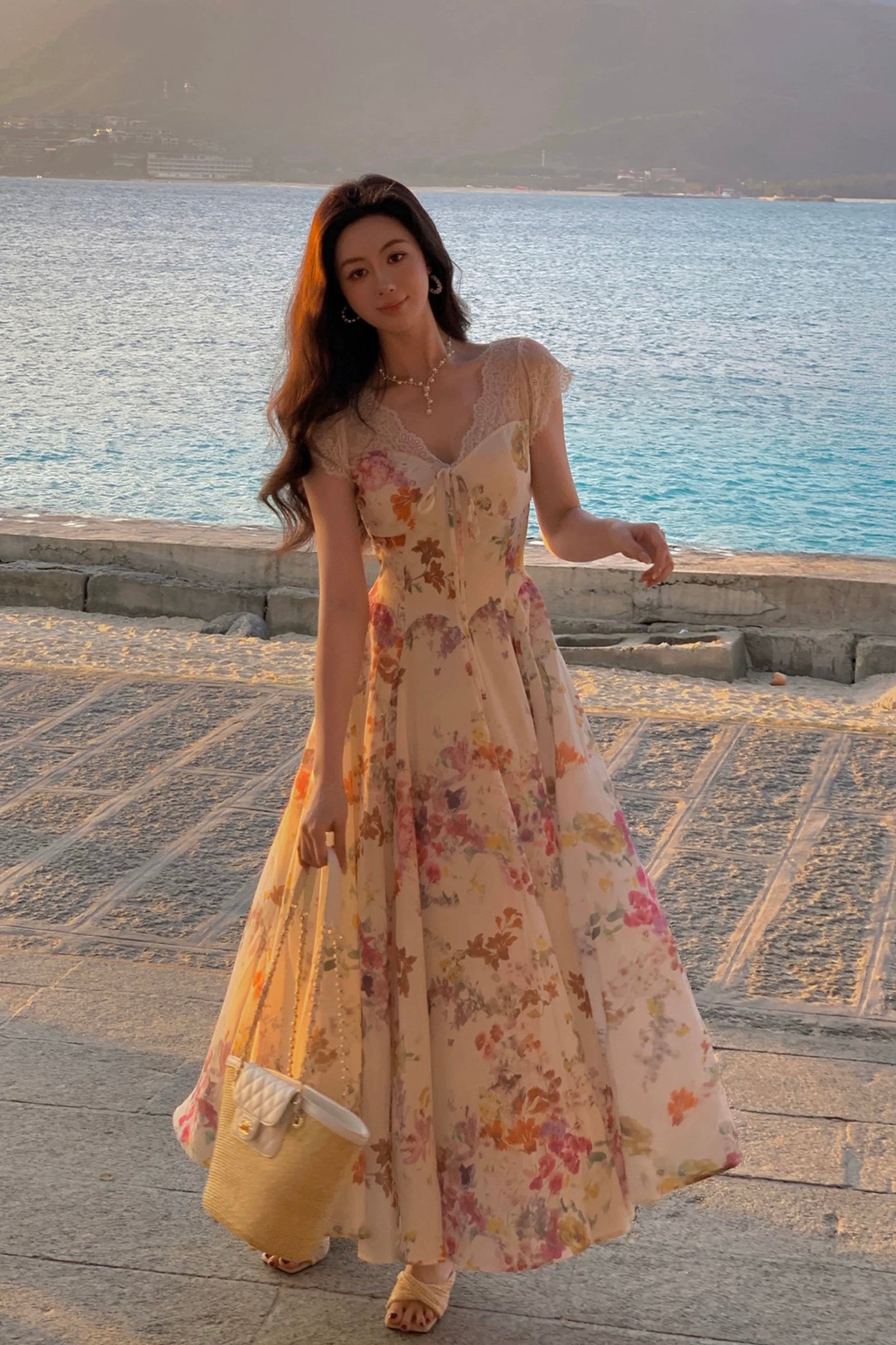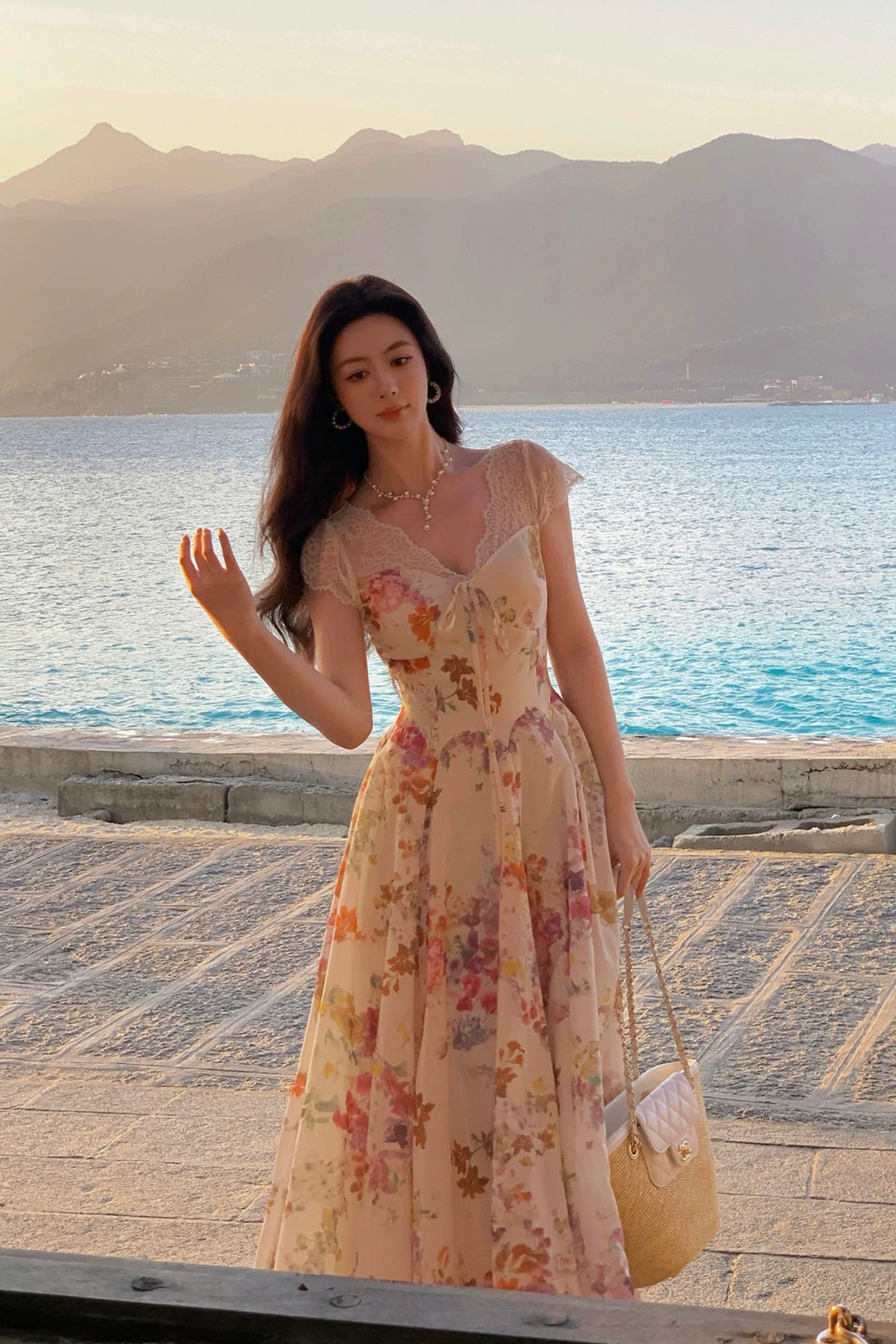 The delicate cap sleeves are paired with lace panel detailing, and the scalloped lace edges fall gently over the shoulders like petals in early spring, refining the shoulder line while adding that soft, feminine touch and avoiding the bareness of a sleeveless cut. The V neckline with its adjustable tie detail subtly frames the face and draws the eye inward, balancing sweetness with structure.