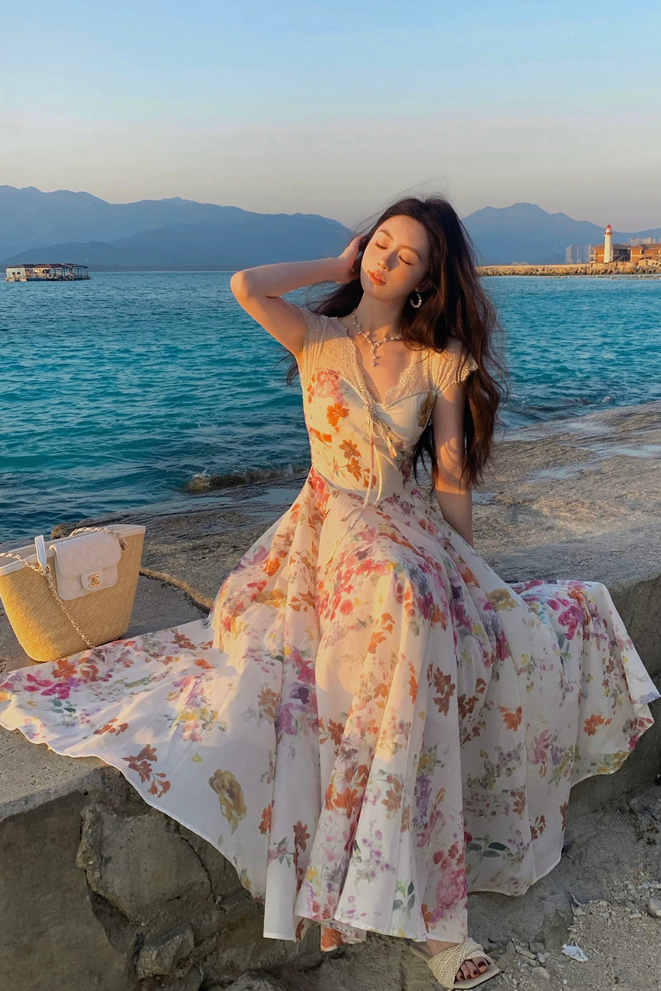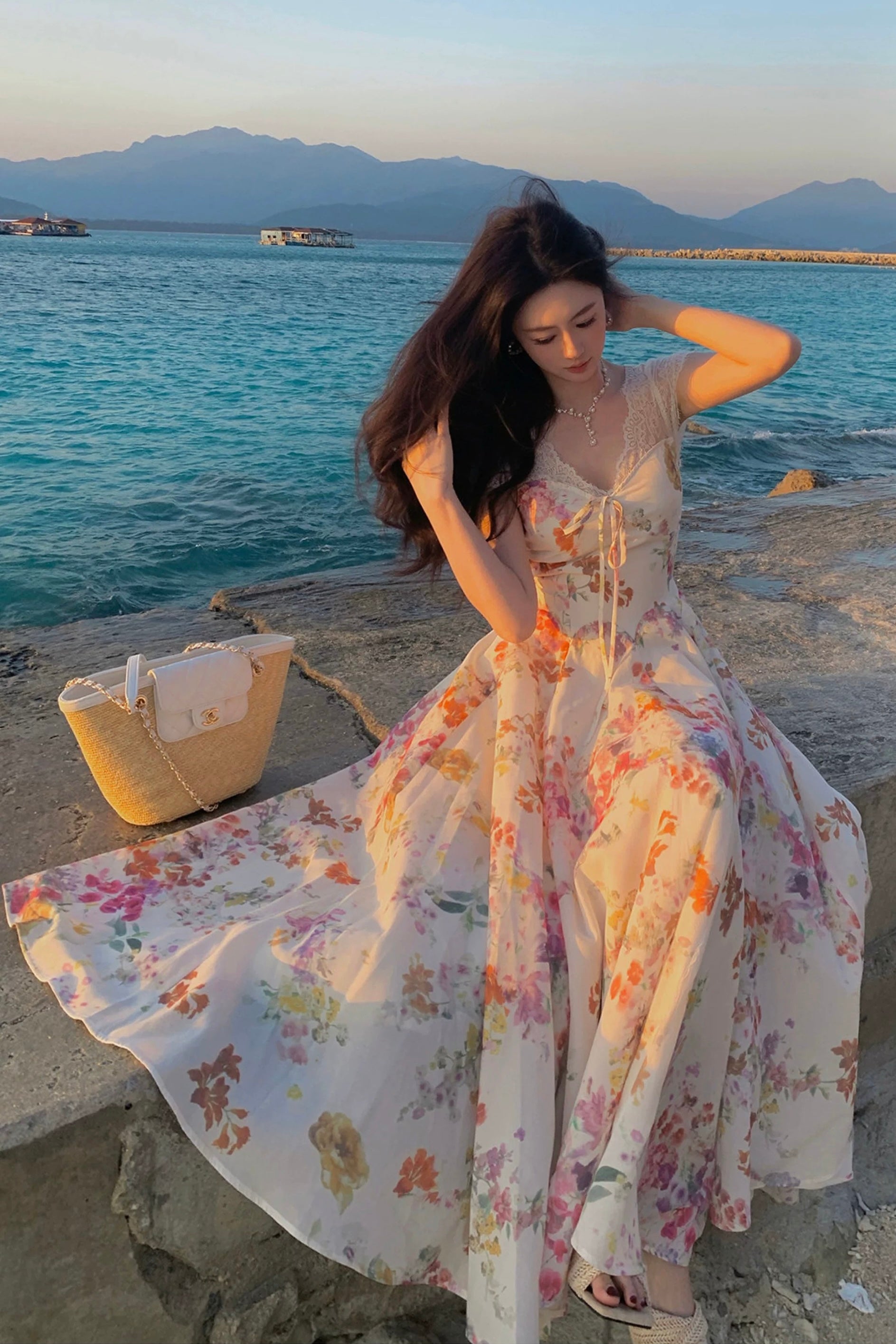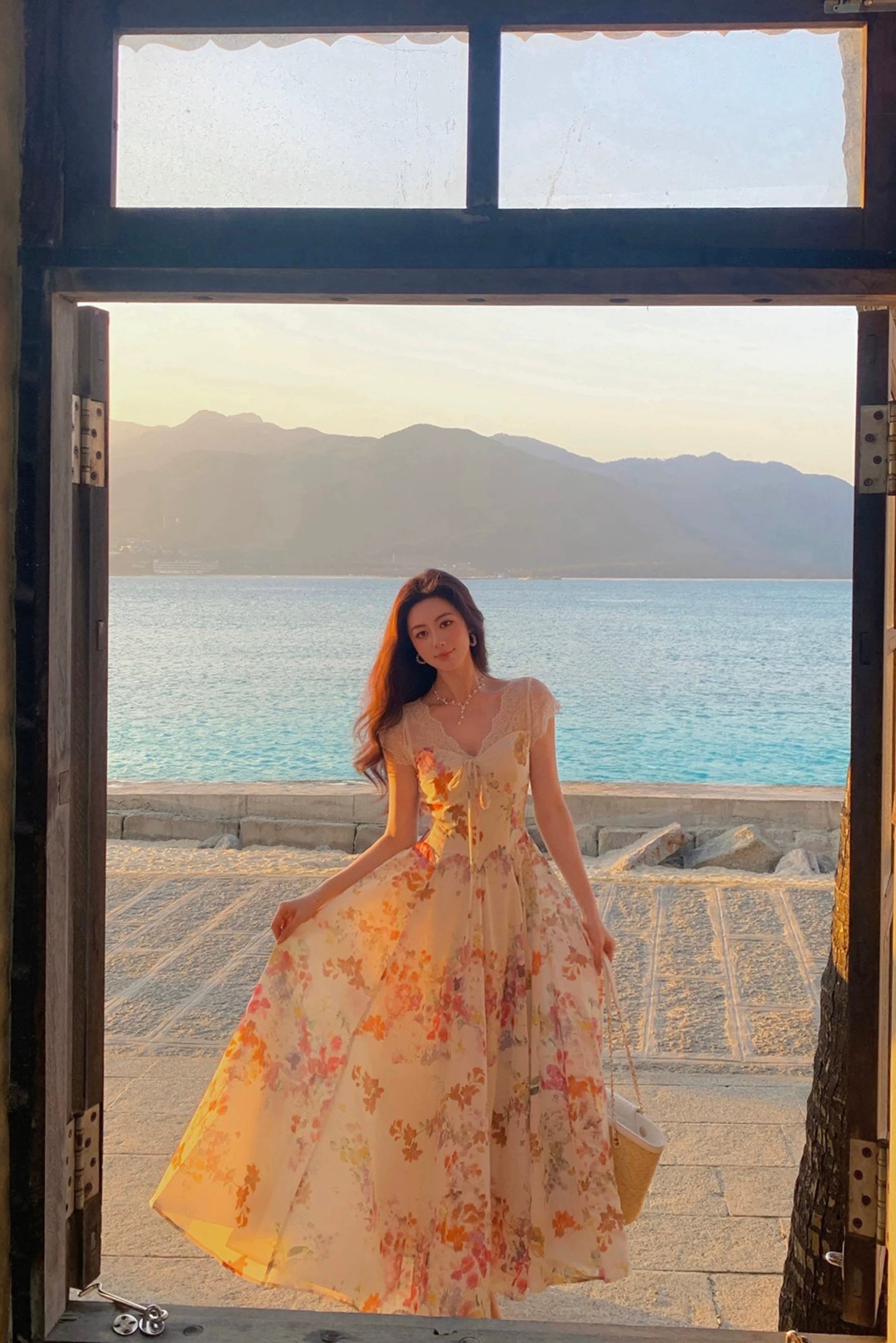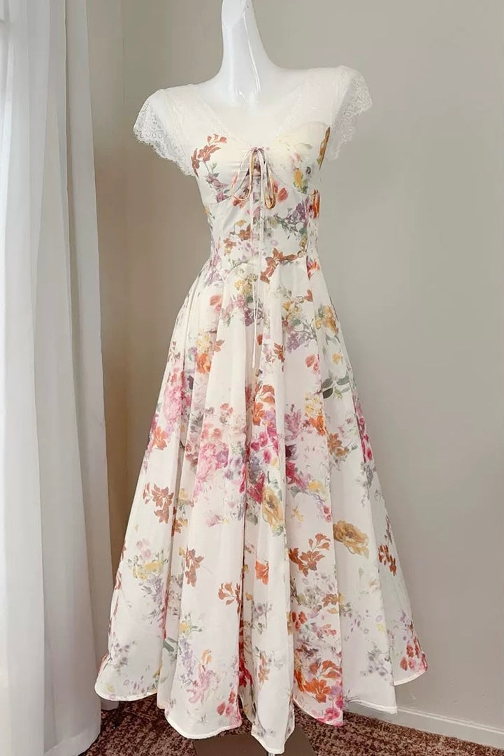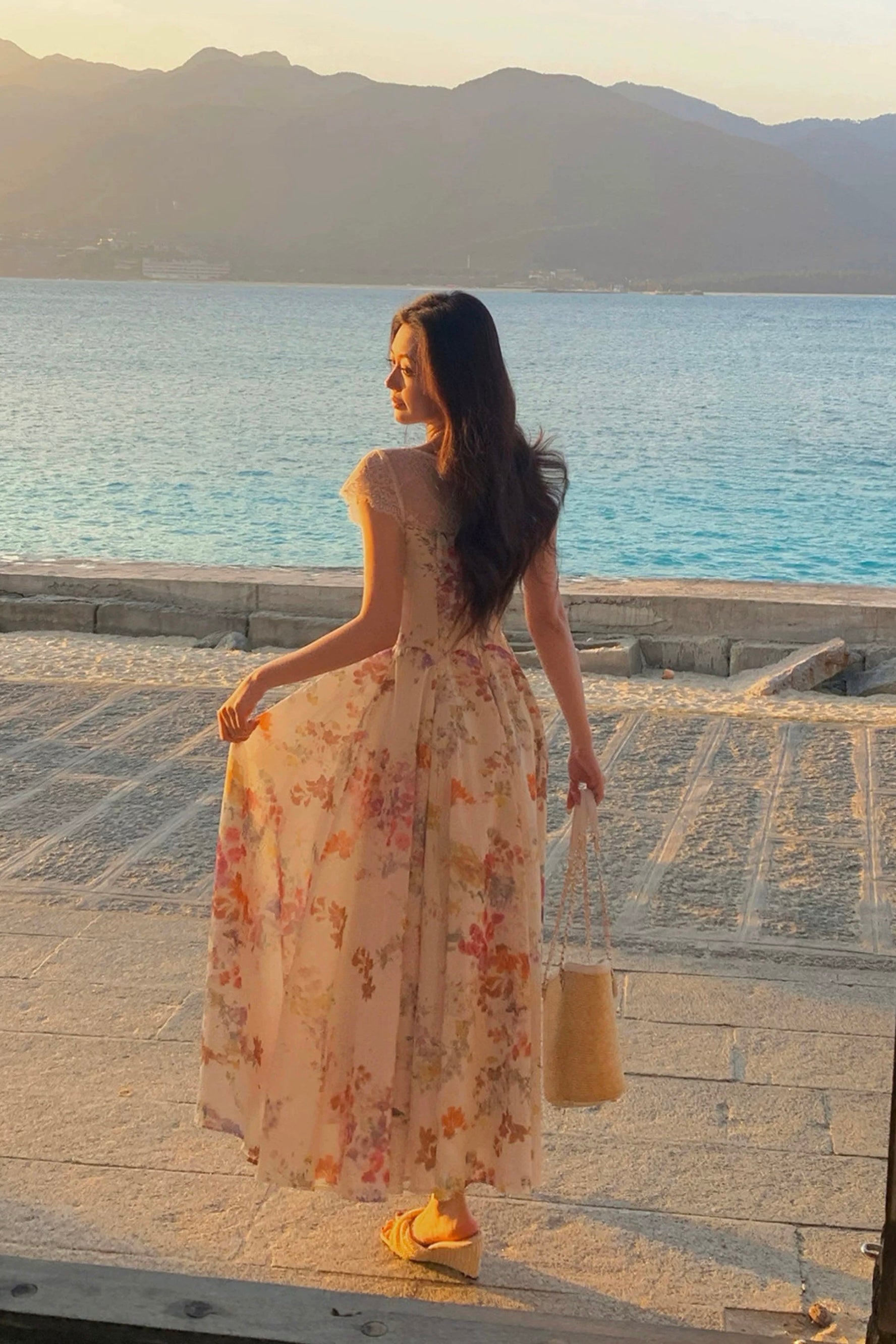 The delicate cap sleeves are paired with lace panel detailing, and the scalloped lace edges fall gently over the shoulders like petals in early spring, refining the shoulder line while adding that soft, feminine touch and avoiding the bareness of a sleeveless cut. The V neckline with its adjustable tie detail subtly frames the face and draws the eye inward, balancing sweetness with structure.