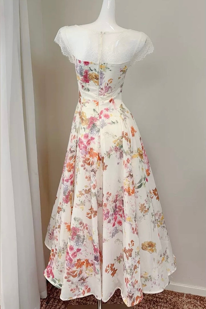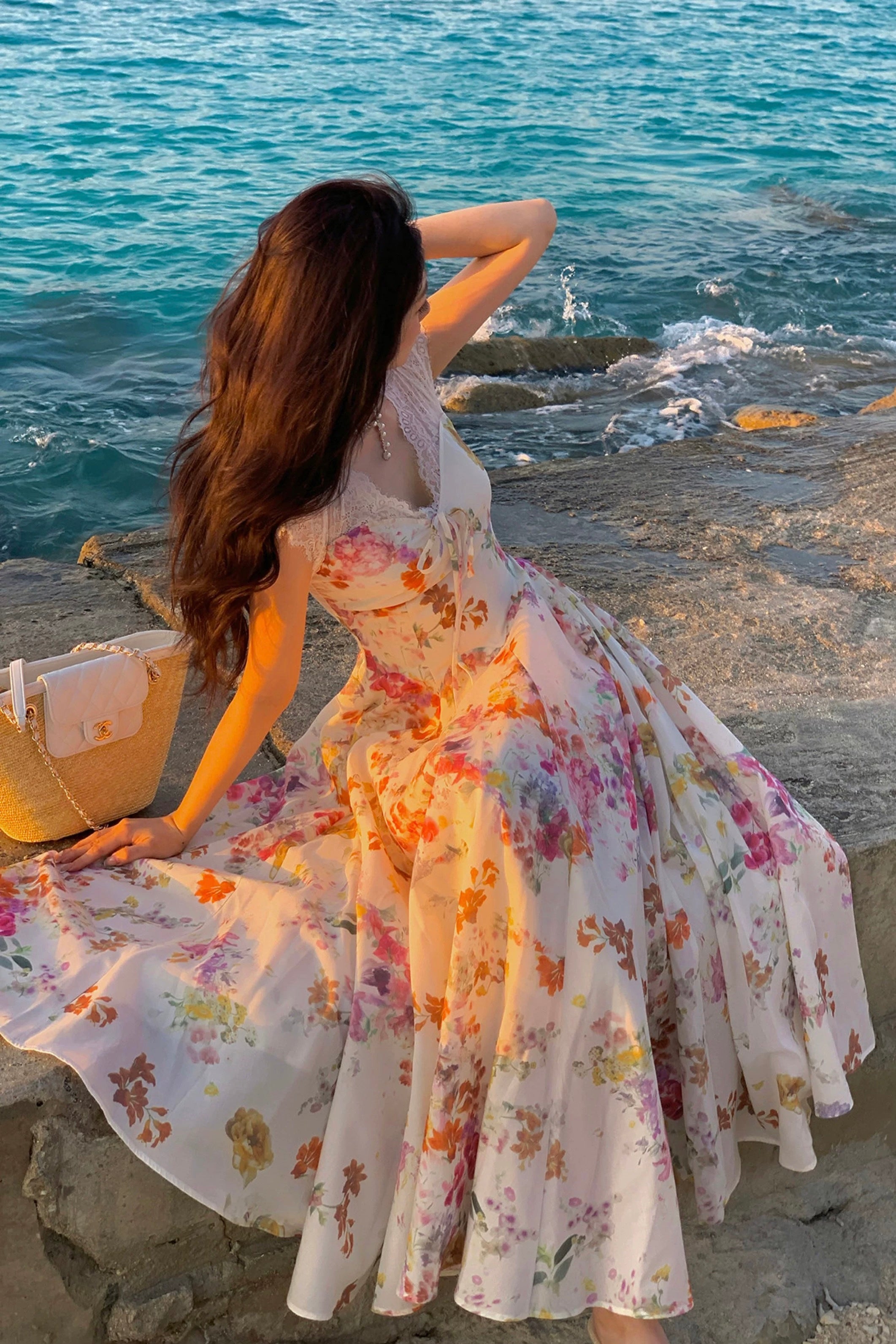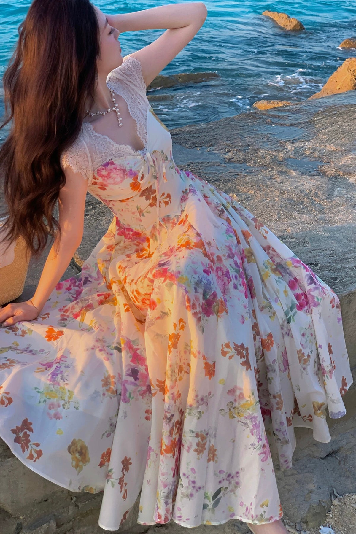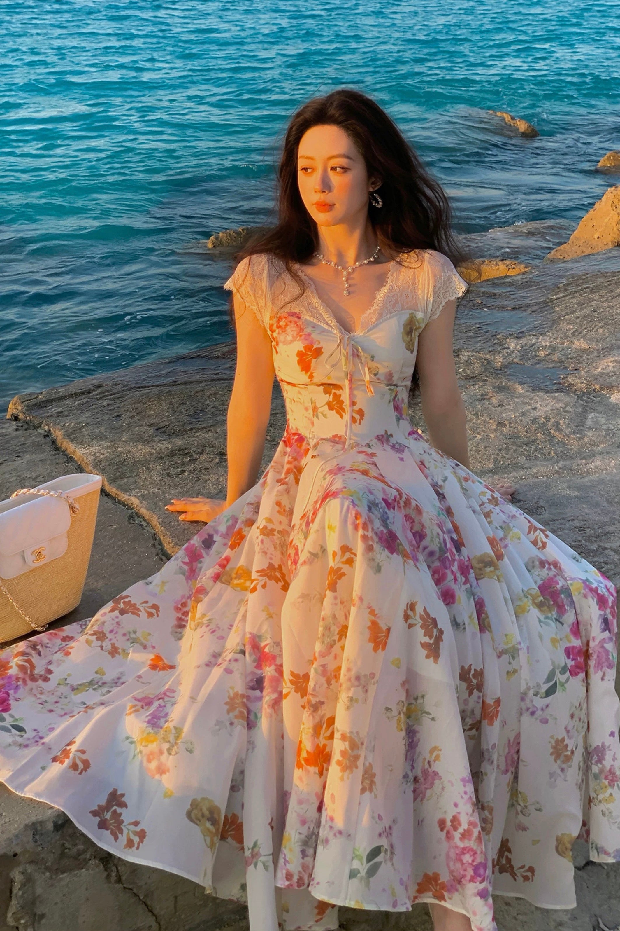 The delicate cap sleeves are paired with lace panel detailing, and the scalloped lace edges fall gently over the shoulders like petals in early spring, refining the shoulder line while adding that soft, feminine touch and avoiding the bareness of a sleeveless cut. The V neckline with its adjustable tie detail subtly frames the face and draws the eye inward, balancing sweetness with structure.