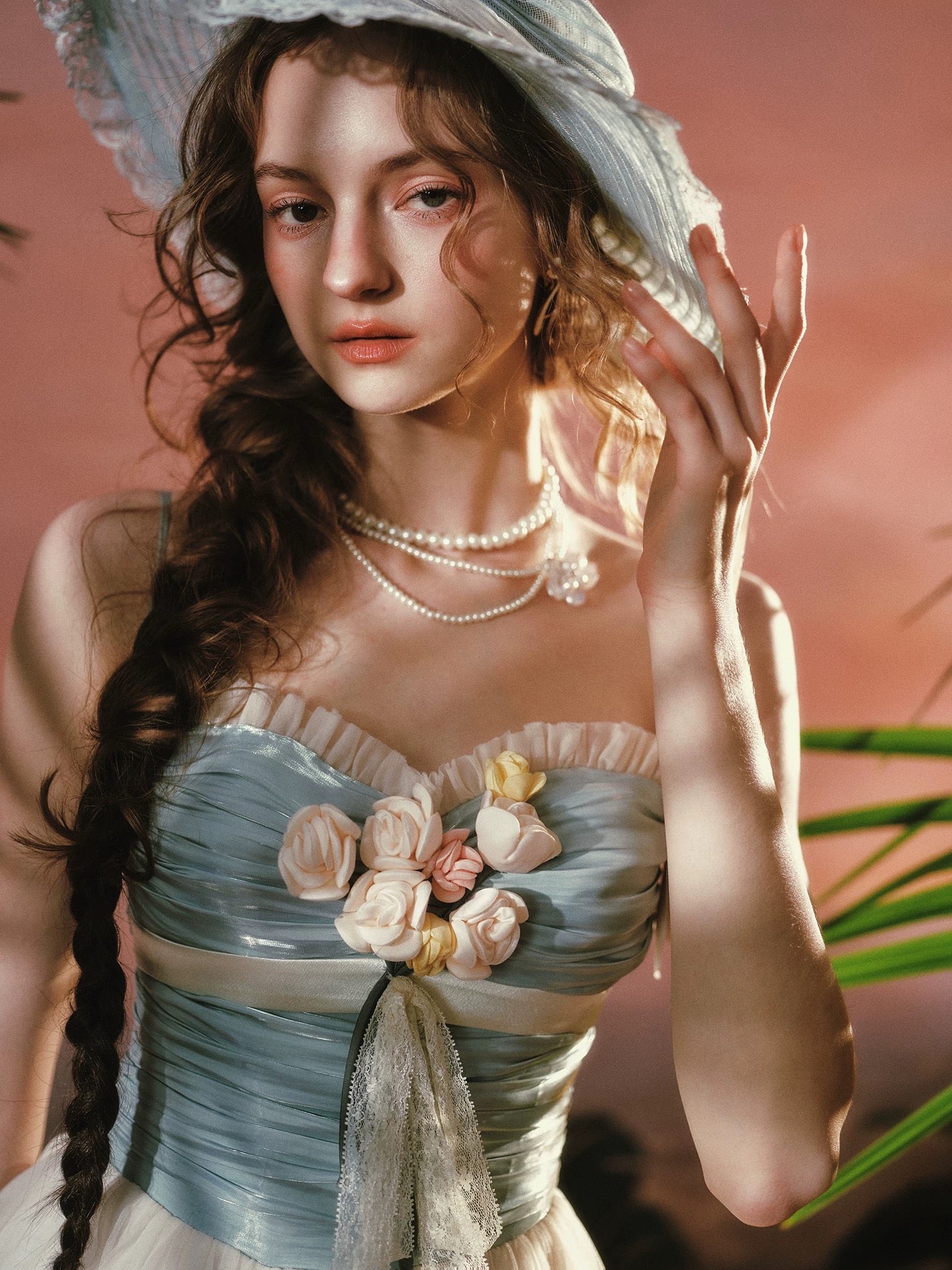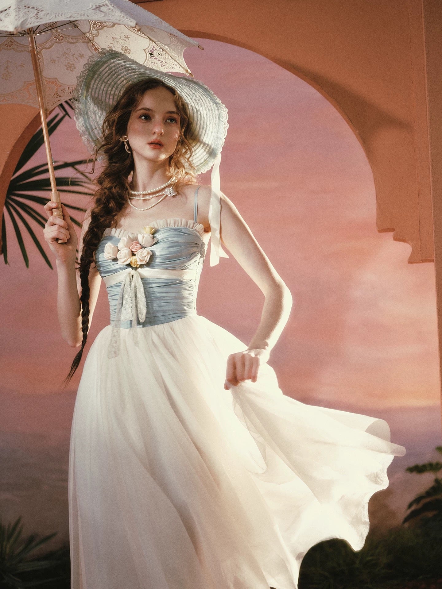 Romantic and softly structured, ‘Sunset Bouquet’ is designed with a ruched bodice in a dreamy dusty blue, delicately framed by a gentle ruffle trim along the neckline. Hand-sewn floral appliqués bloom across the bust, creating that instantly eye-catching focal point we love, while a soft ribbon detail adds a graceful, feminine finish.