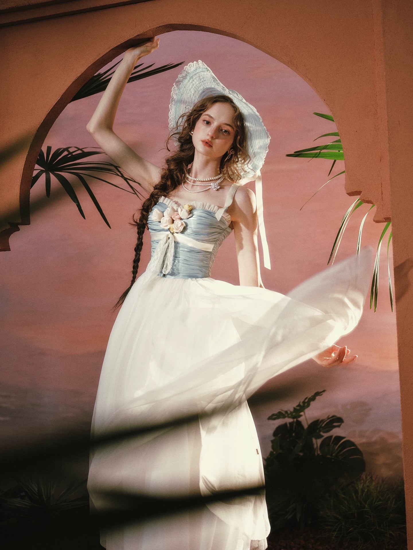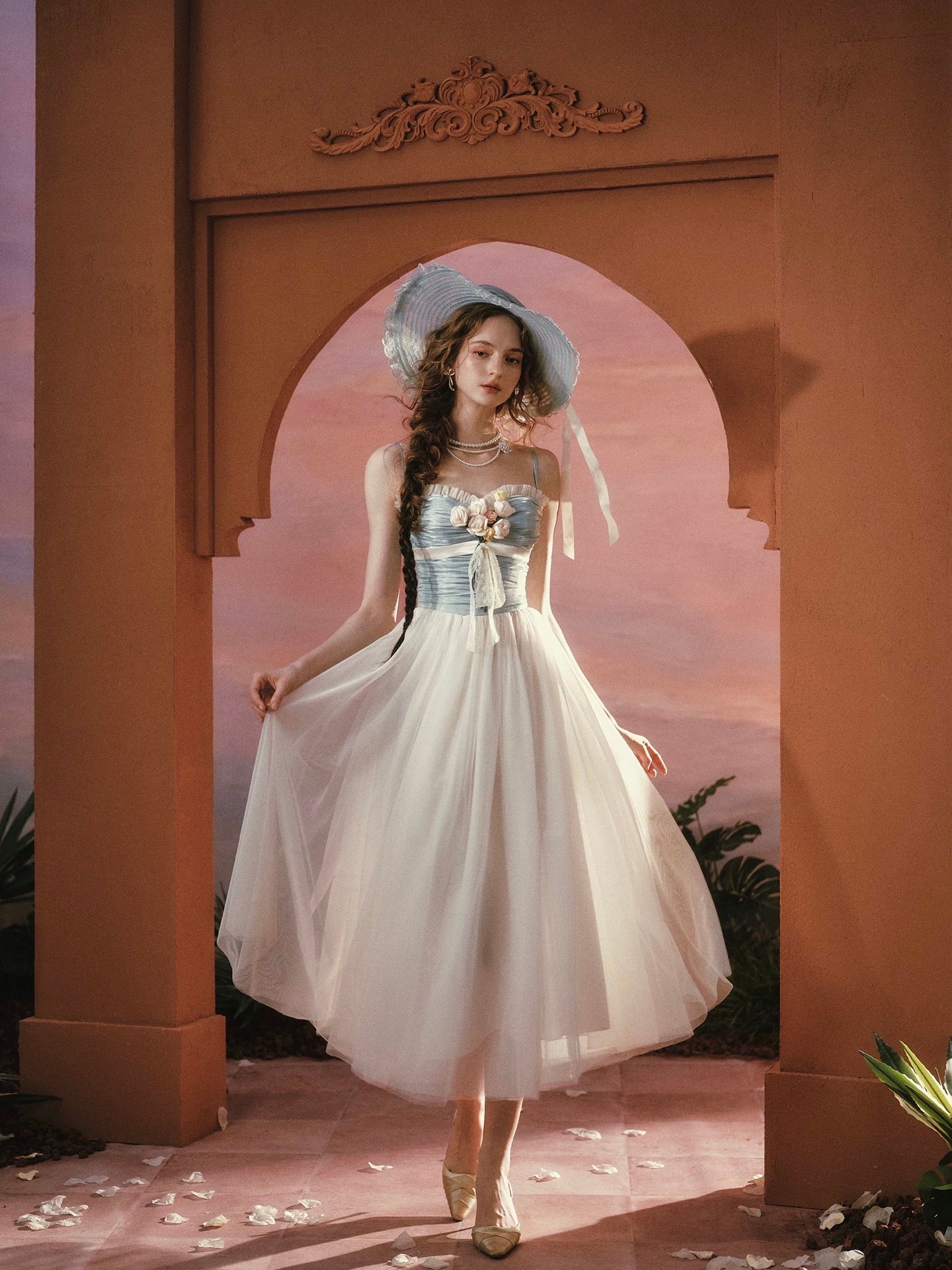 The airy tulle skirt is supported with a layer of firm mesh underneath to create that romantic, voluminous shape. Light, floaty, and effortlessly elegant, ‘Sunset Bouquet’ moves like a whisper with every step.