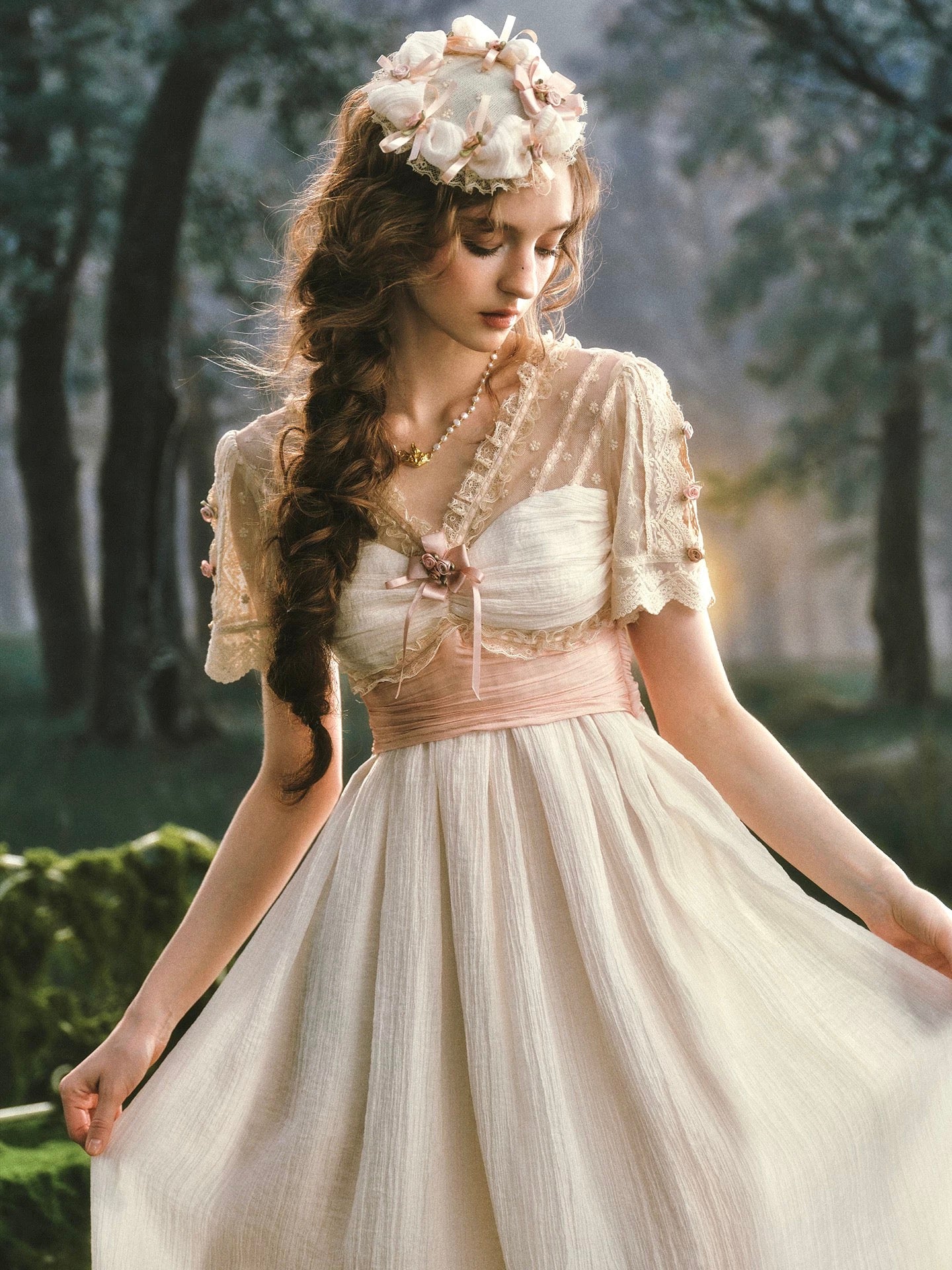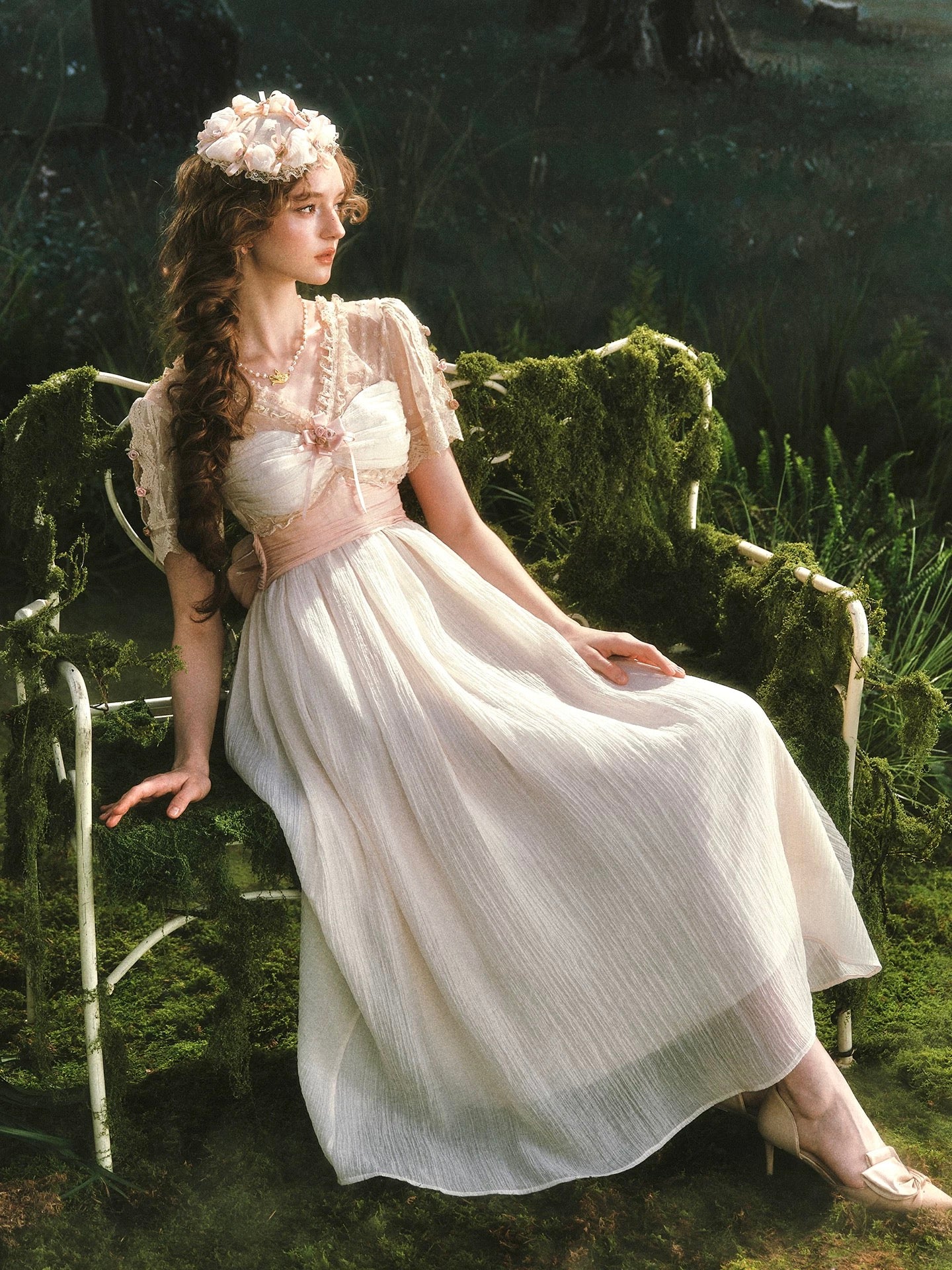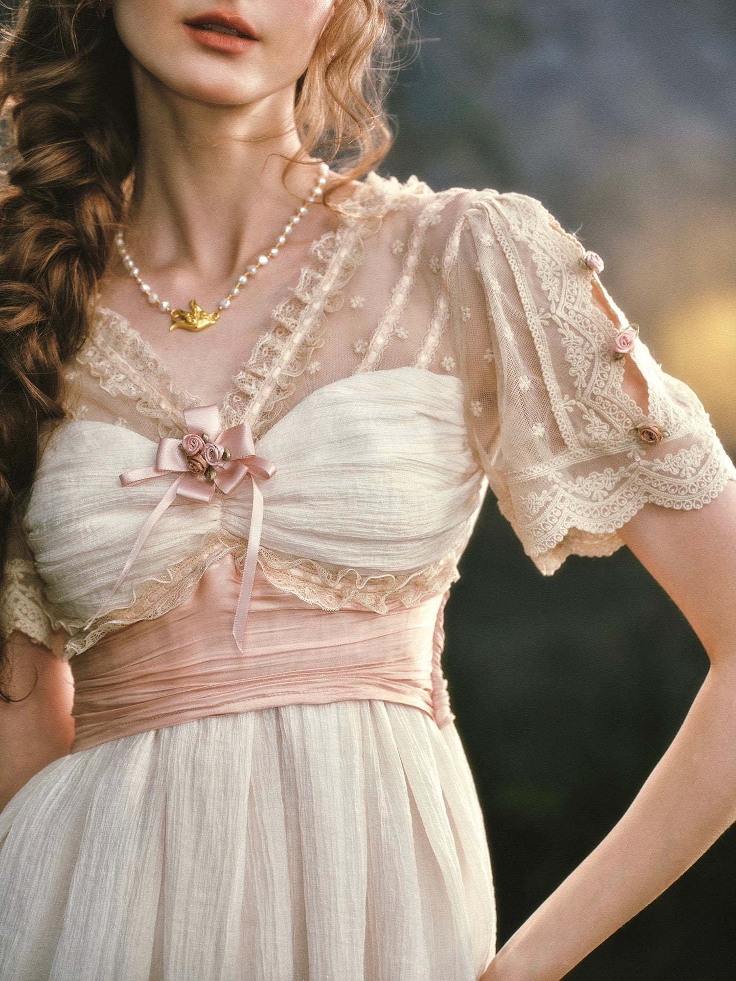 We designed ‘Verdant Lullaby’ with a flattering V-neckline that gently elongates the neckline and frames the collarbones in the most delicate way. The bodice is softly ruched and trimmed with lace, finished with a blush ribbon bow and tiny rosette detailing that feels sweet, subtle, and thoughtfully placed, the kind of detail you notice twice.