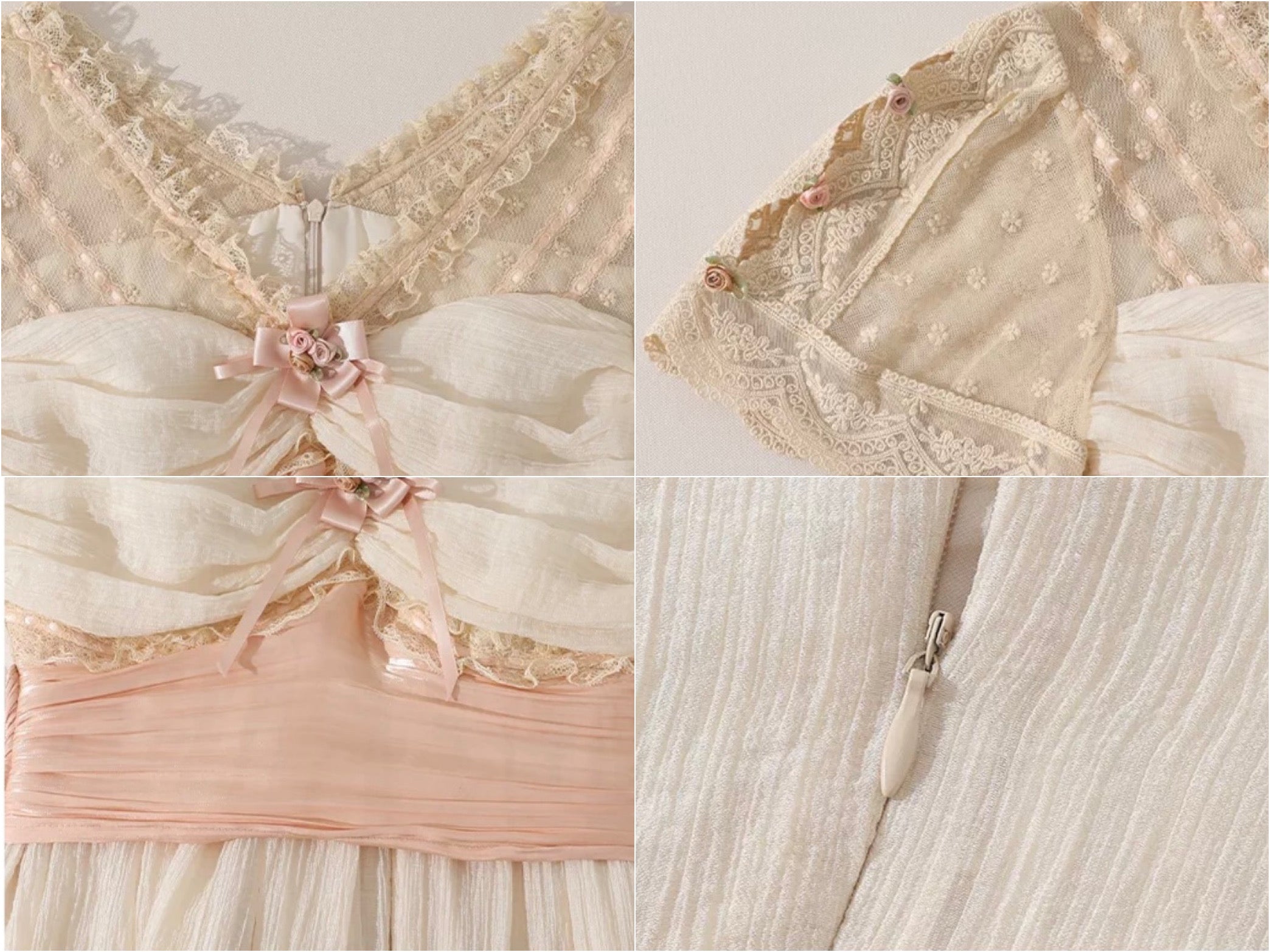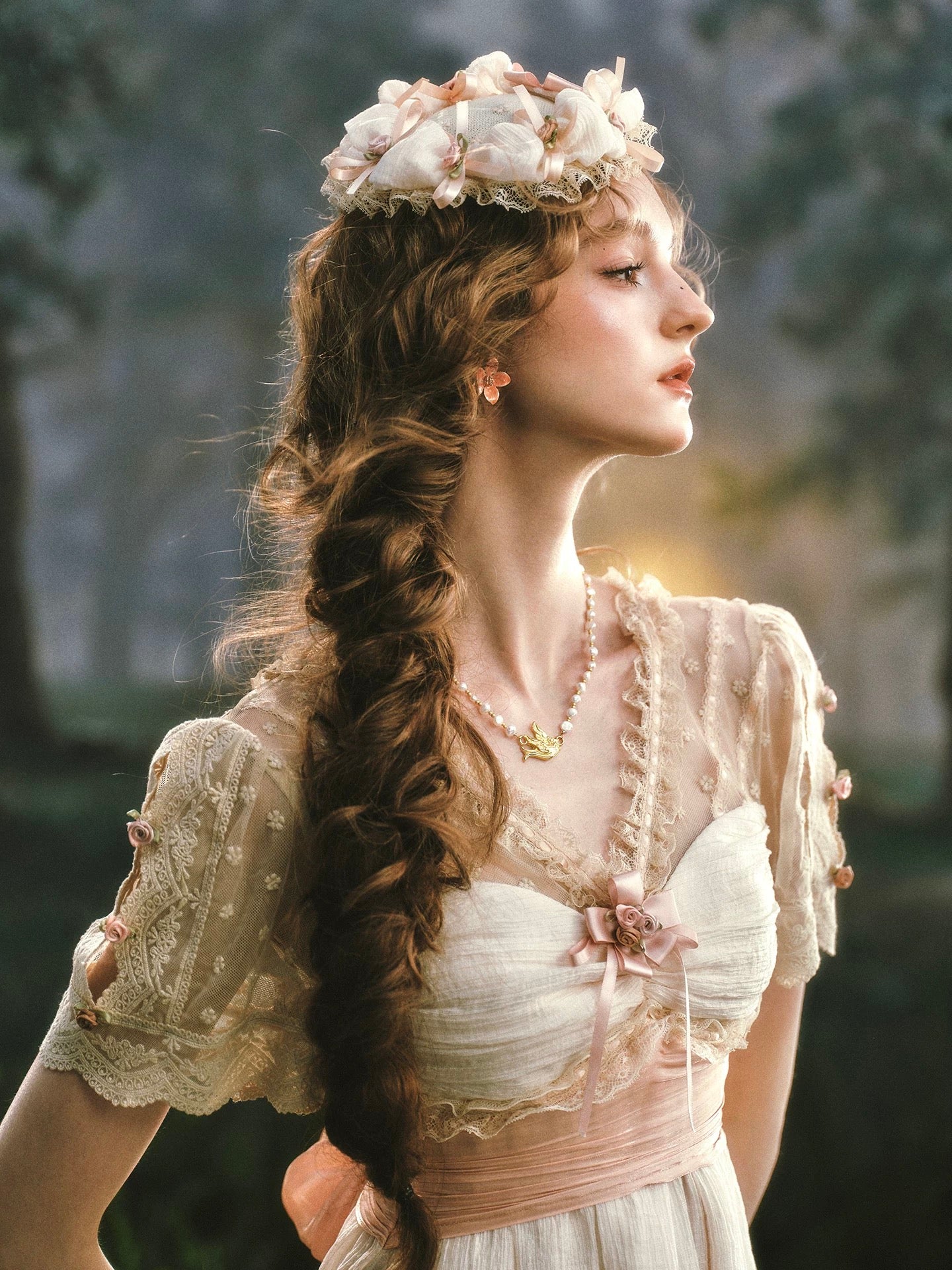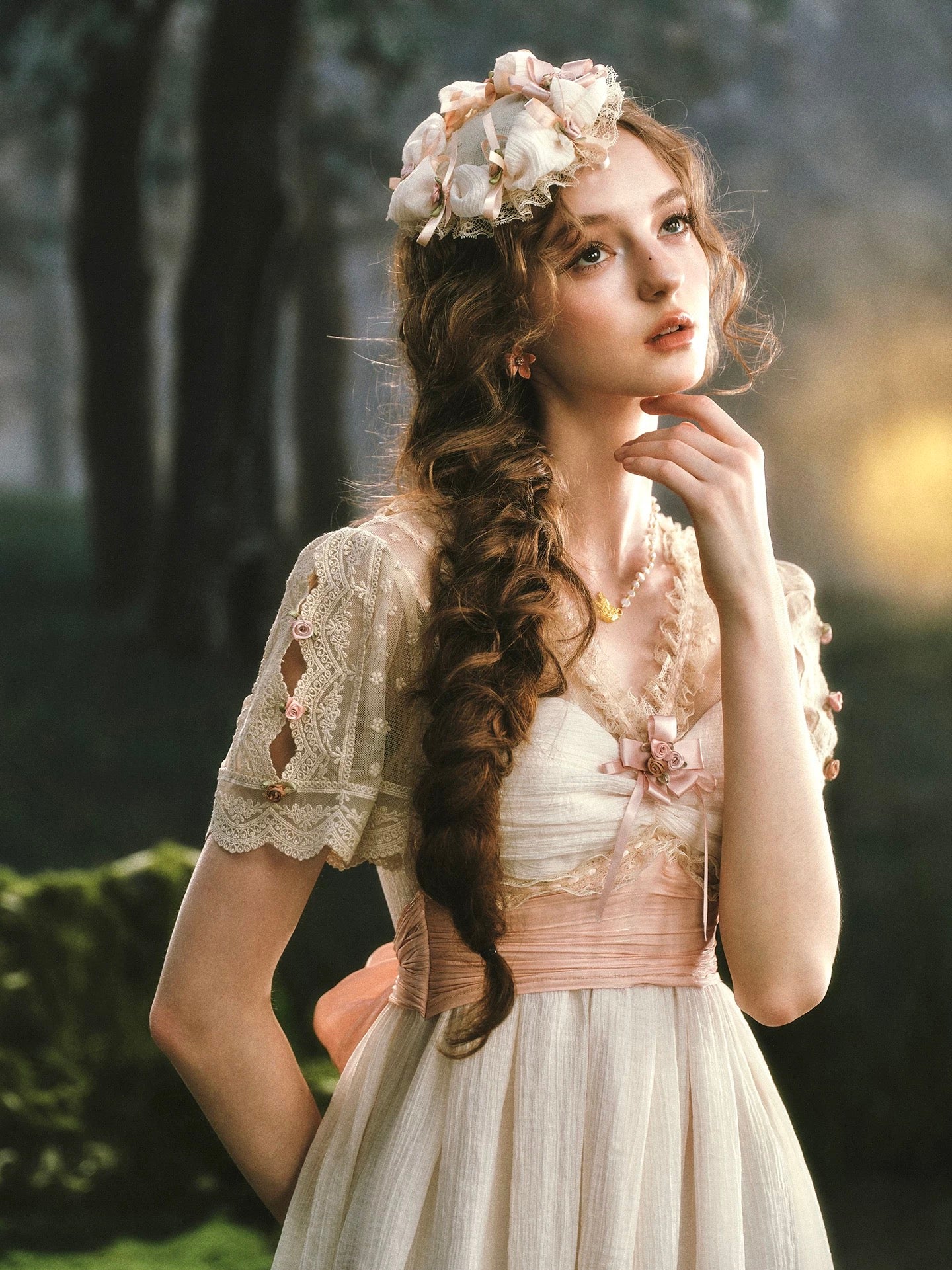 We designed ‘Verdant Lullaby’ with a flattering V-neckline that gently elongates the neckline and frames the collarbones in the most delicate way. The bodice is softly ruched and trimmed with lace, finished with a blush ribbon bow and tiny rosette detailing that feels sweet, subtle, and thoughtfully placed, the kind of detail you notice twice.