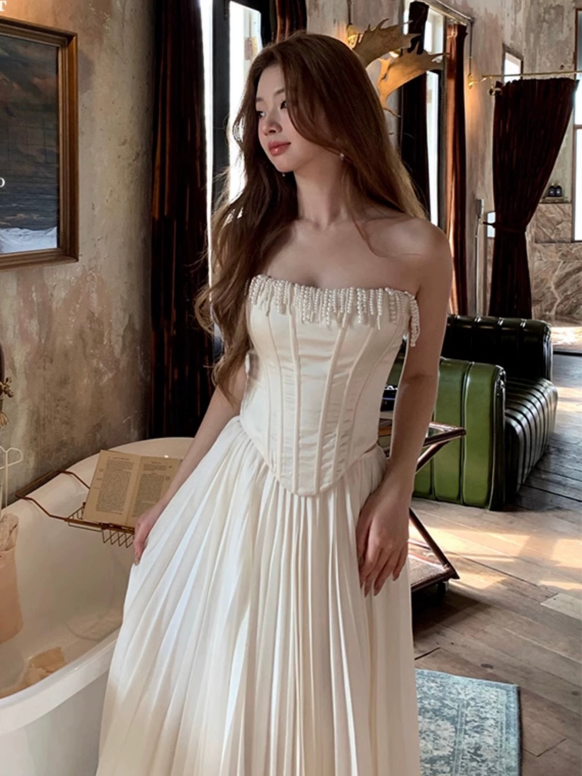 The Mirelys corset top is love at first glance—the corset alone is enough to steal the spotlight. A cascade of irregular pearl drops, perfectly placed across the bust like a soft whisper of luxury. Every pearl is hand-threaded, sitting delicately between ten carefully structured boning channels that sculpt and flatter without overwhelming. Yes, it takes time—but it’s so worth it.