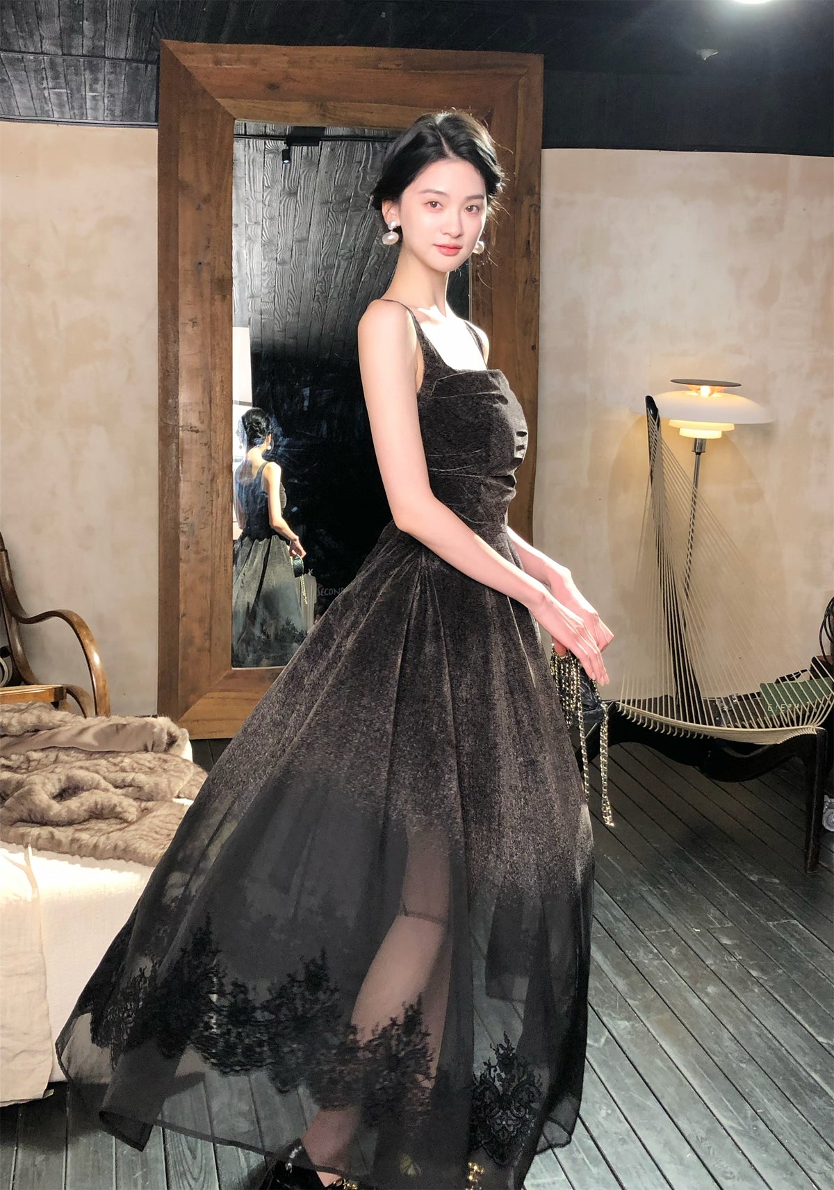We spun a custom ombré velvet that melts from smoky charcoal to sheer graphite tulle, then framed the fade with delicate black lace so every step flickers like embers catching the breeze. Can you picture that glow under low lights?