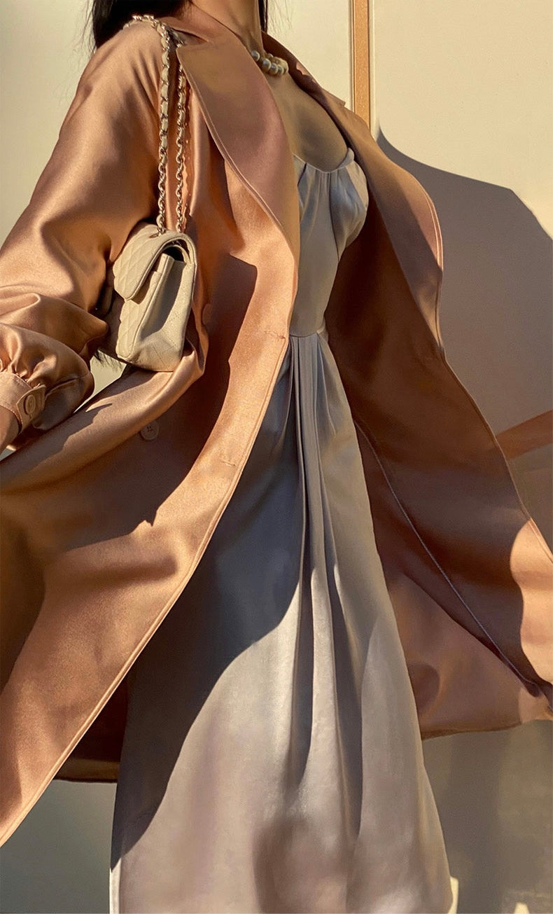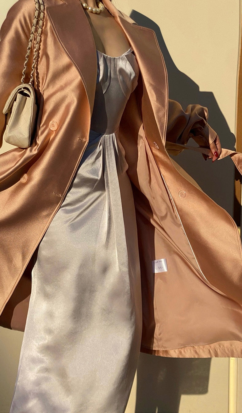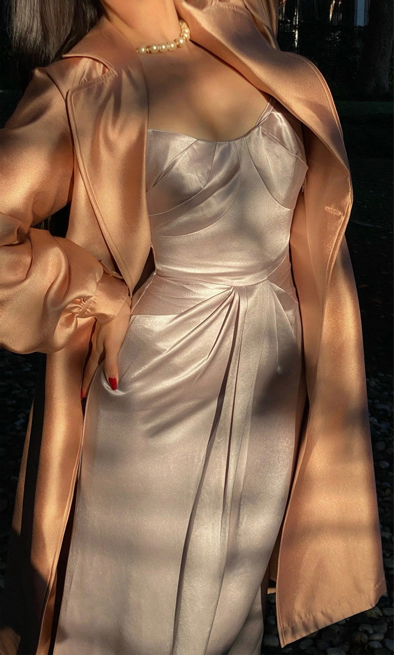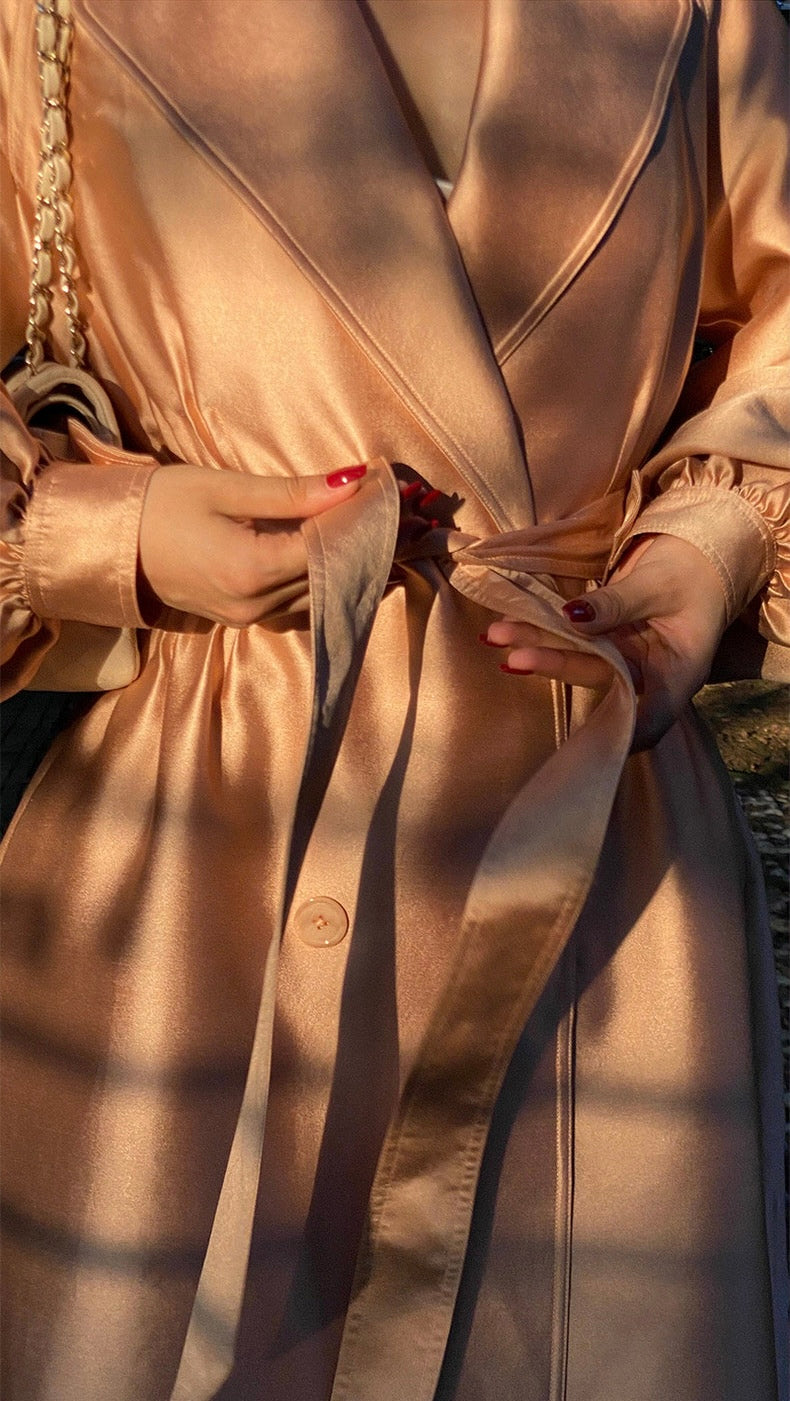 Our Champagne Rose Gold shade glows like moonlight over the sea, soft, warm, and quietly luxurious. It comes with a matching self tie belt to keep the look harmonious and refined.