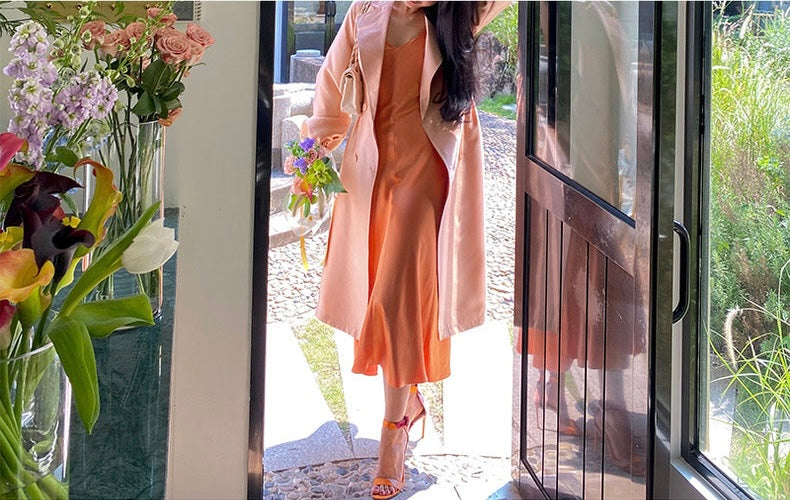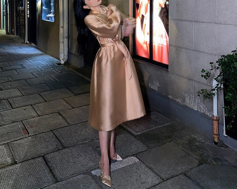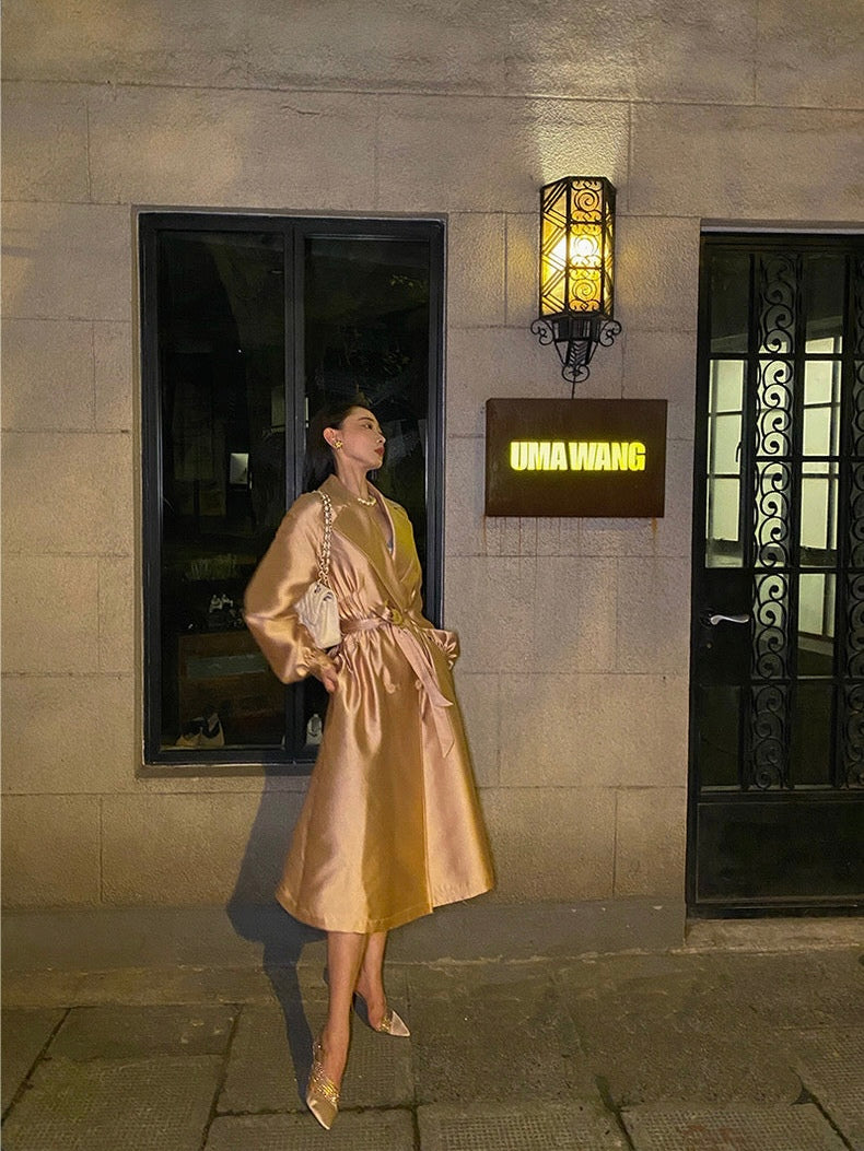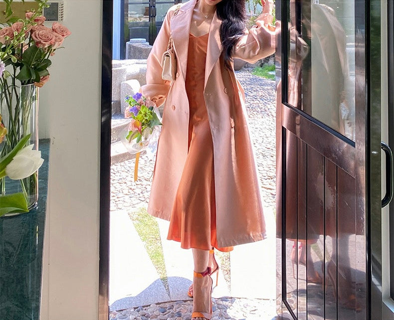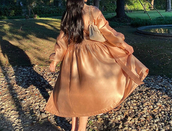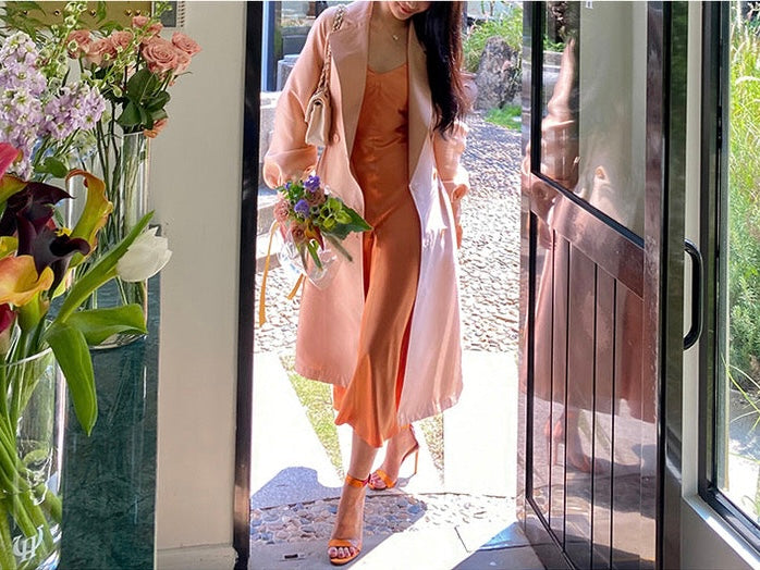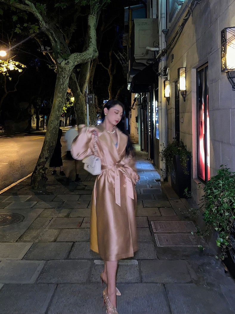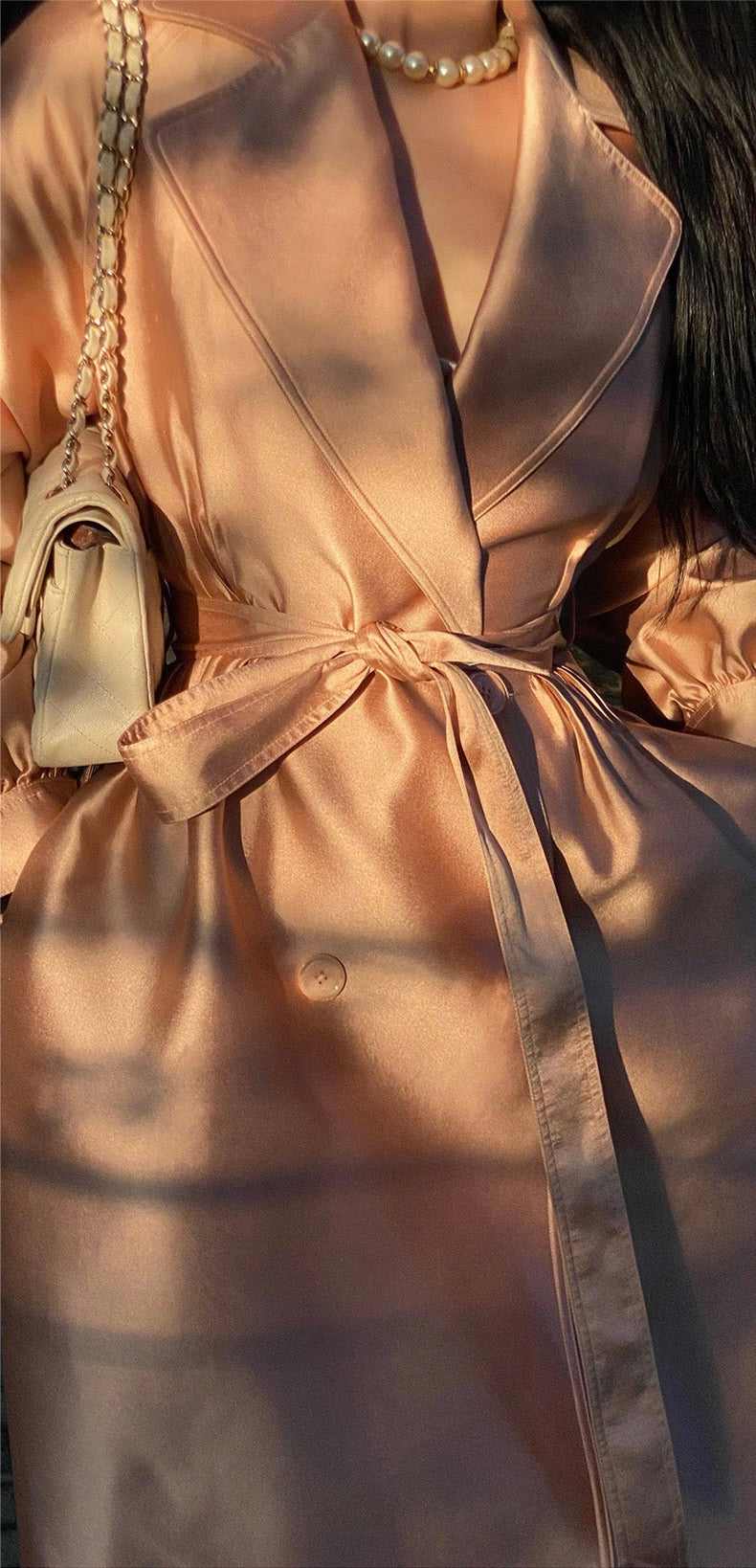 Our Champagne Rose Gold shade glows like moonlight over the sea, soft, warm, and quietly luxurious. It comes with a matching self tie belt to keep the look harmonious and refined.