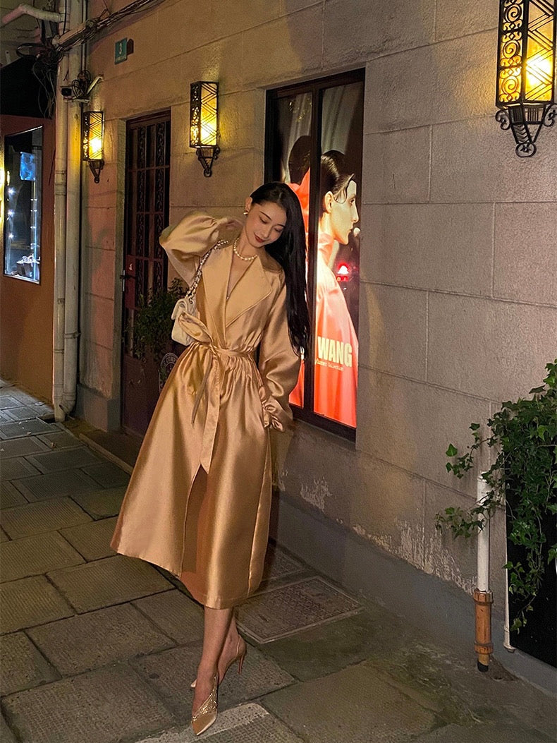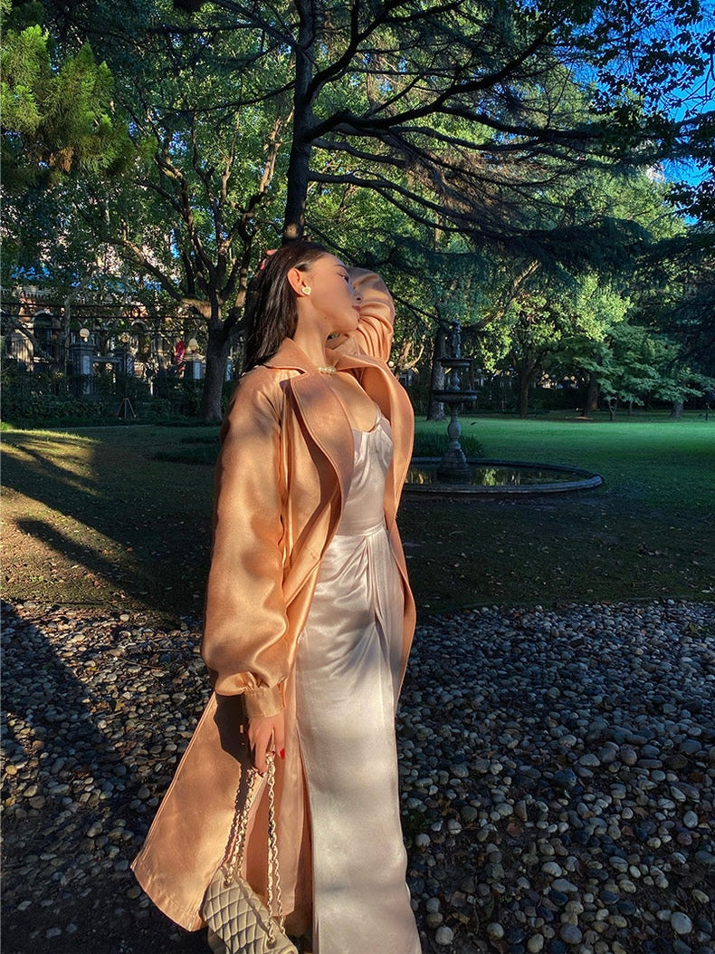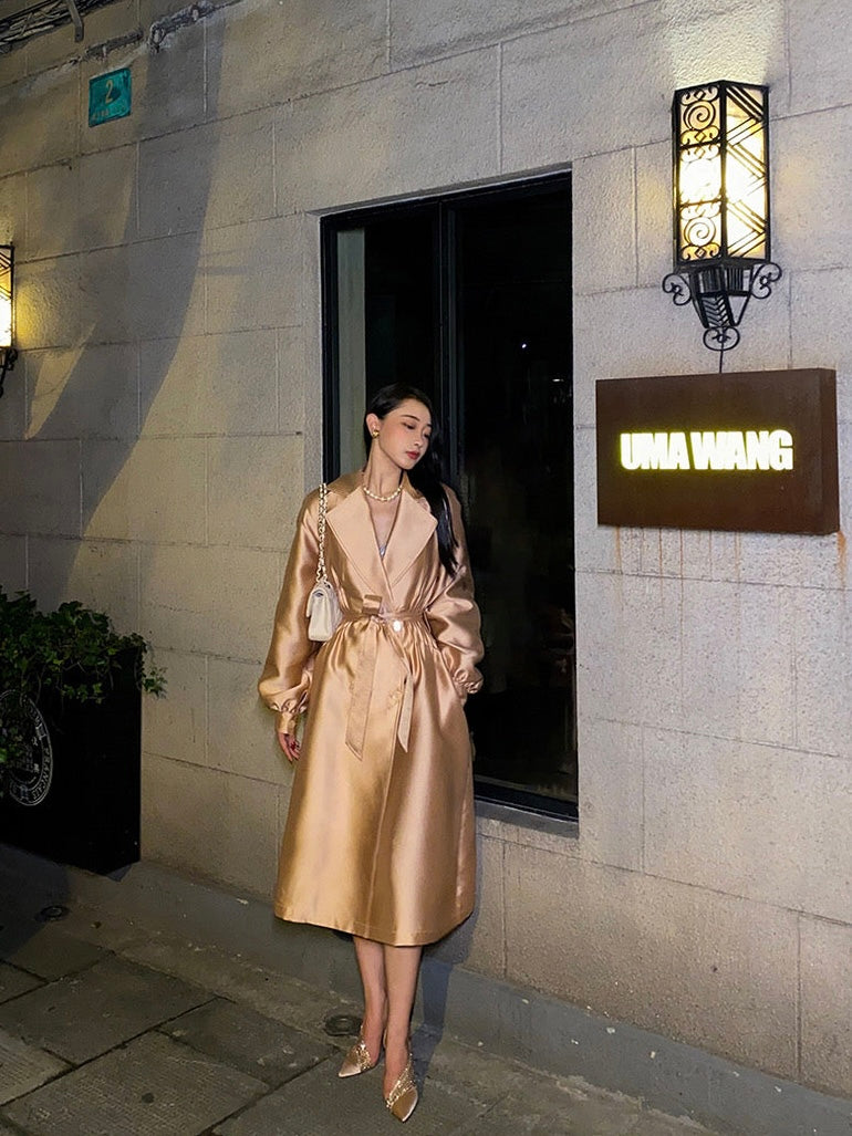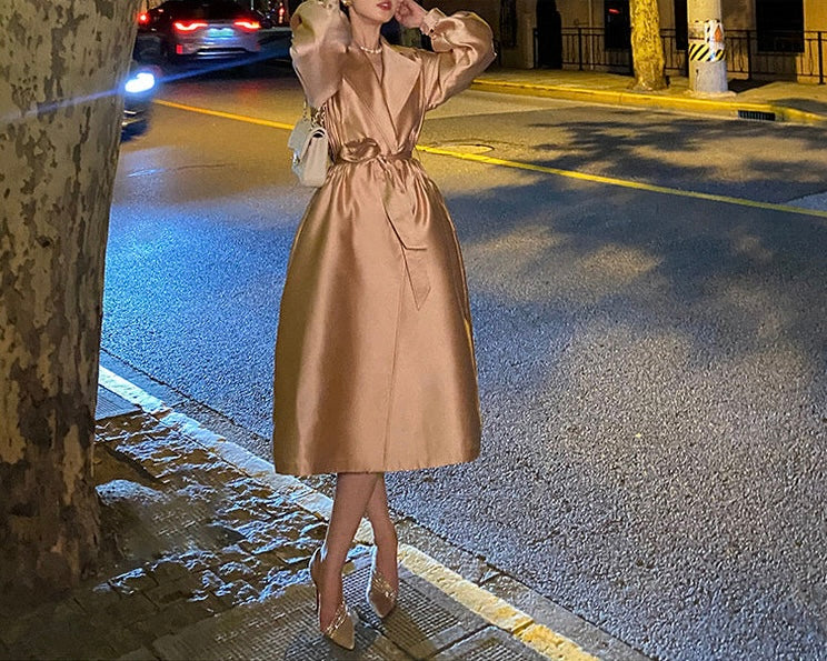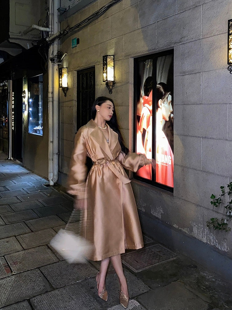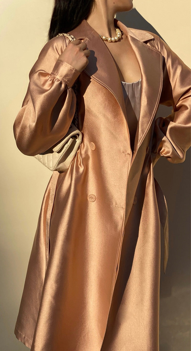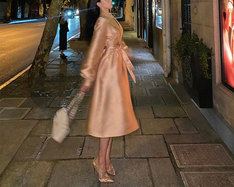 We designed this A line trench to move with you like music, structured yet fluid, polished yet poetic. The silhouette begins with a sweeping hem and cinched waist, paired with billowy lantern sleeves that lend a soft drama and vintage charm. Whether you’re walking into a concert hall or simply strolling through a quiet winter street, there’s a quiet magic to the way it flows.