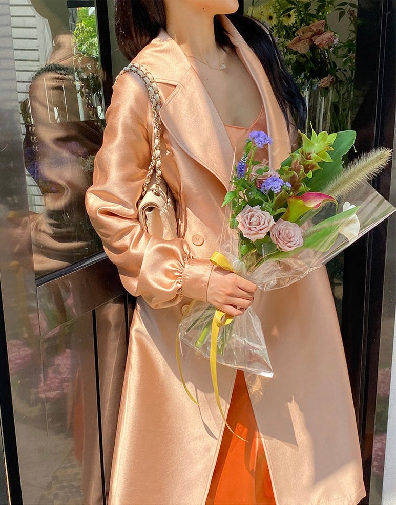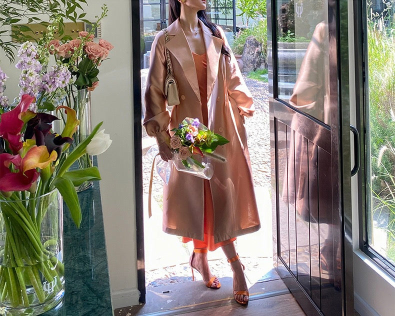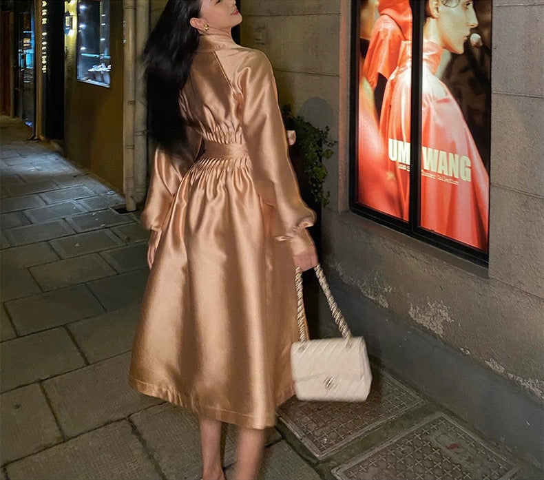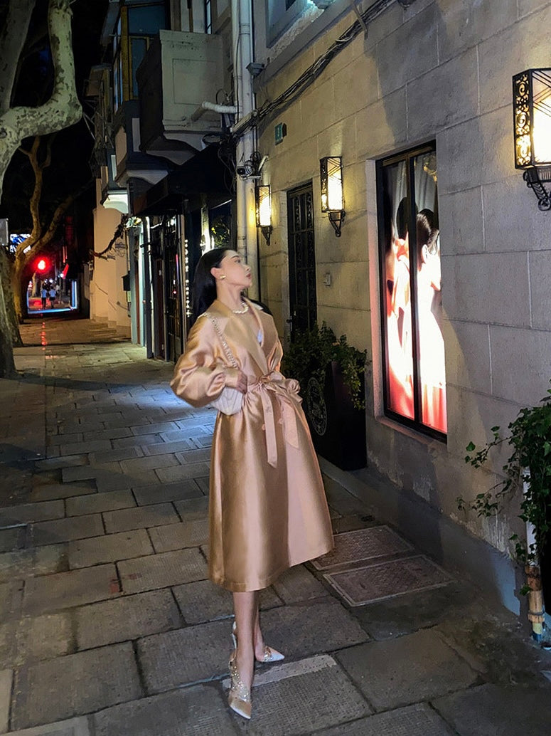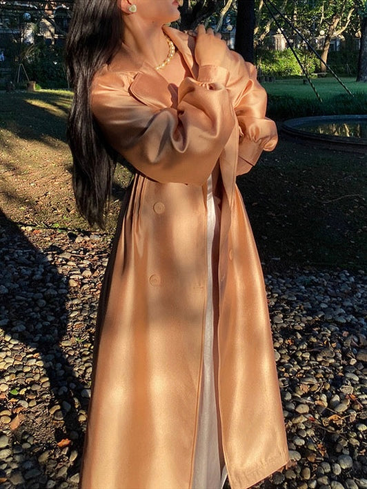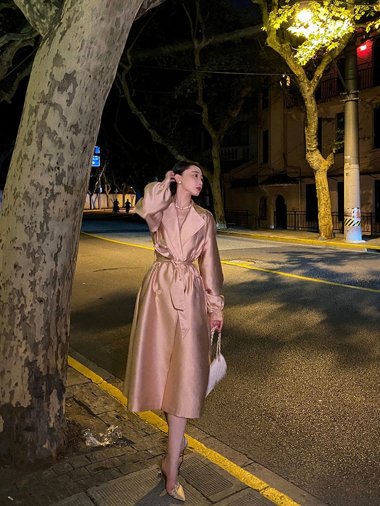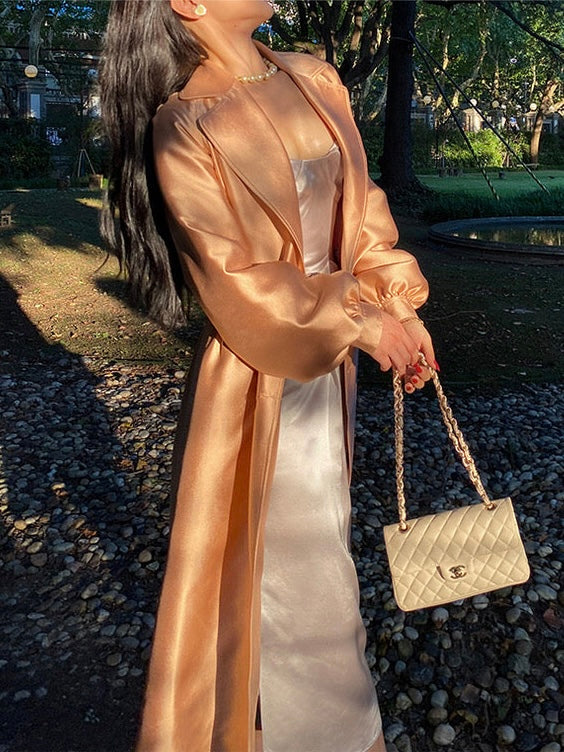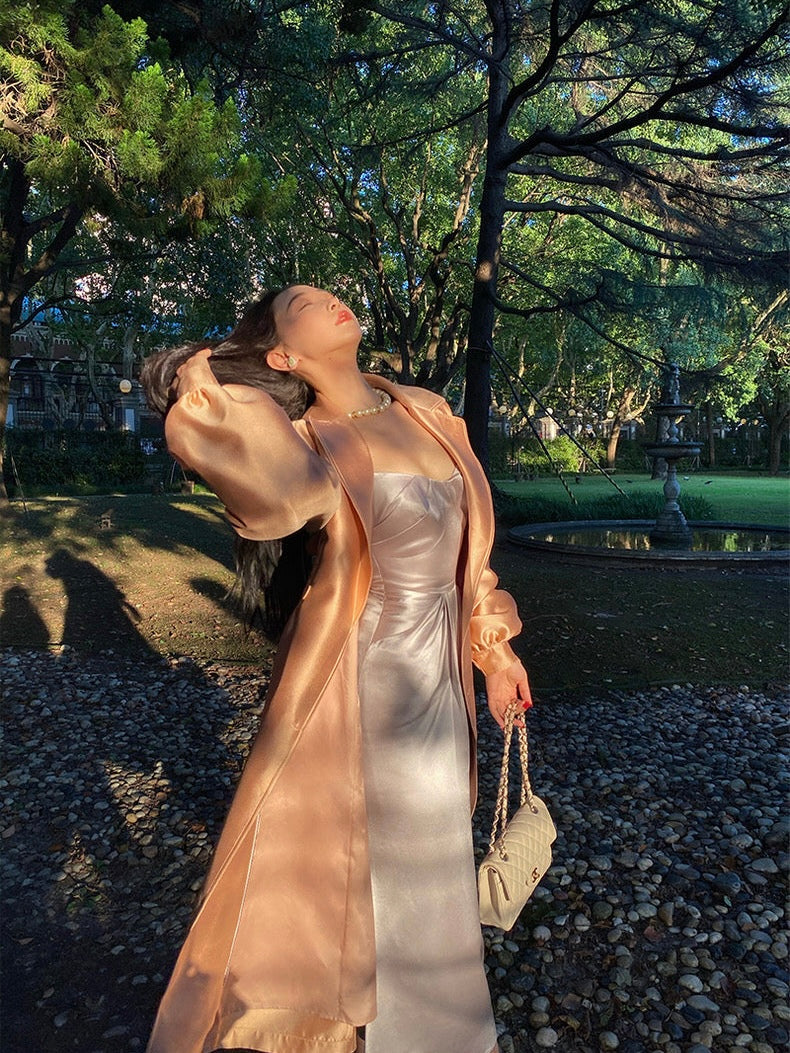 We designed this A line trench to move with you like music, structured yet fluid, polished yet poetic. The silhouette begins with a sweeping hem and cinched waist, paired with billowy lantern sleeves that lend a soft drama and vintage charm. Whether you’re walking into a concert hall or simply strolling through a quiet winter street, there’s a quiet magic to the way it flows.
