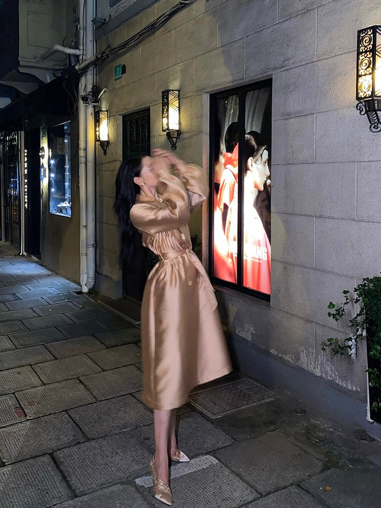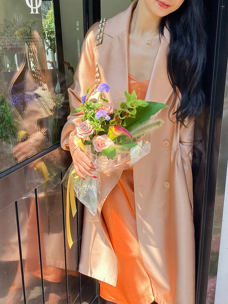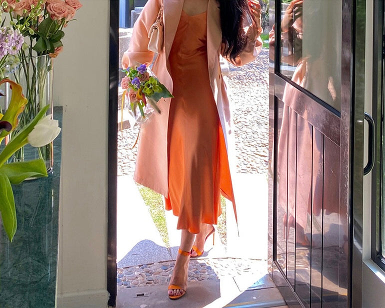 The fabric? A matte satin blend that feels like silk with the body of wool, lightweight, warm, softly luminous, and easy to care for. At every turn, it catches the light in the most enchanting way.